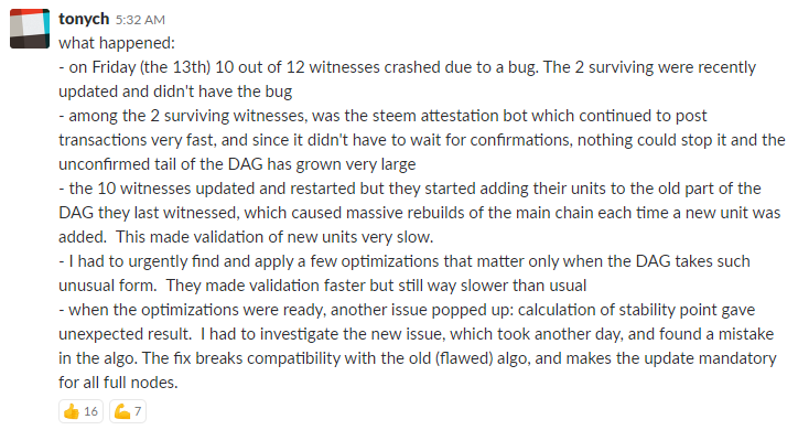 - この生き残った2台においてSteem認証機能ボットがすごい早さで連投を続け、このトランザクションには確認が不要だったために止める事ができず、DAG(ブロックチェーンに代わる新技術)上の未確認の情報のつながりが非常に大きくなってしまった。