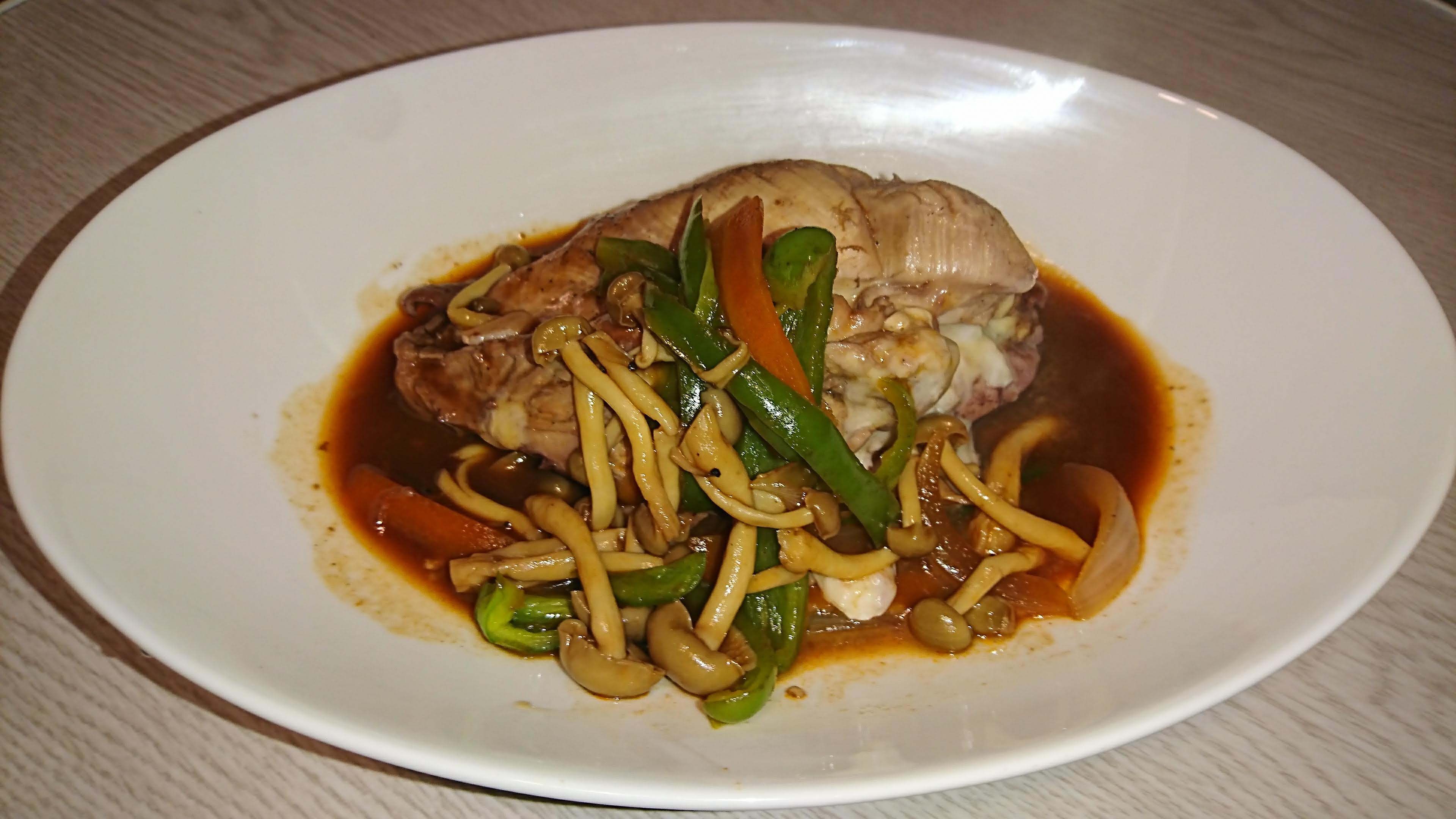 白ワインで鶏むね肉・野菜・ニンニクを蒸し、バジルとオリーブオイルで香りを付けました。