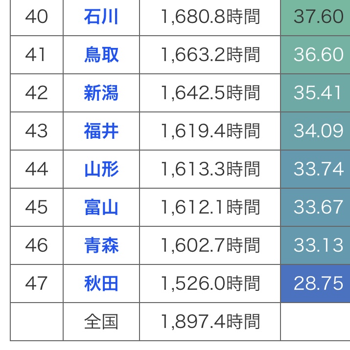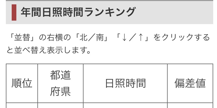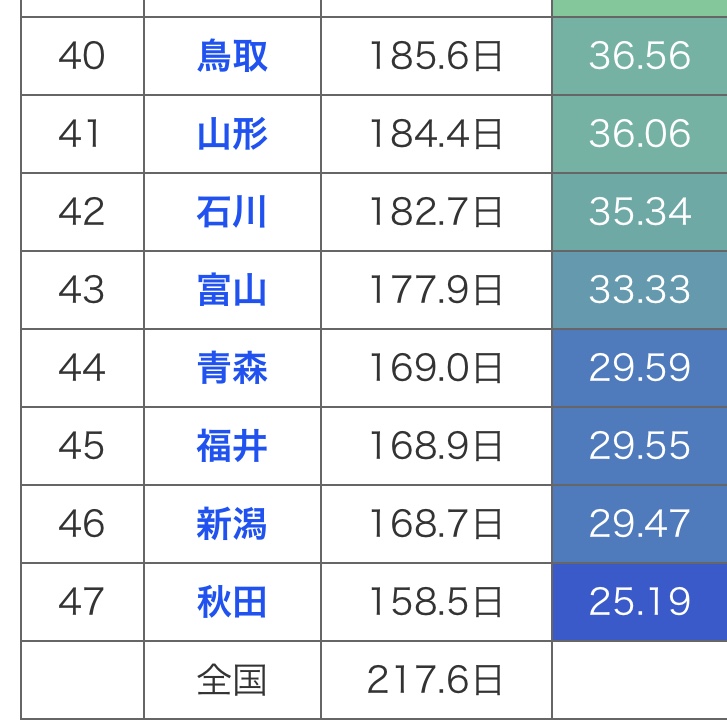 年間日照時間は、47都道府県中45位で
