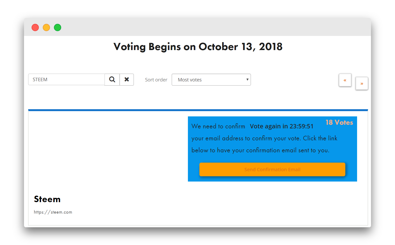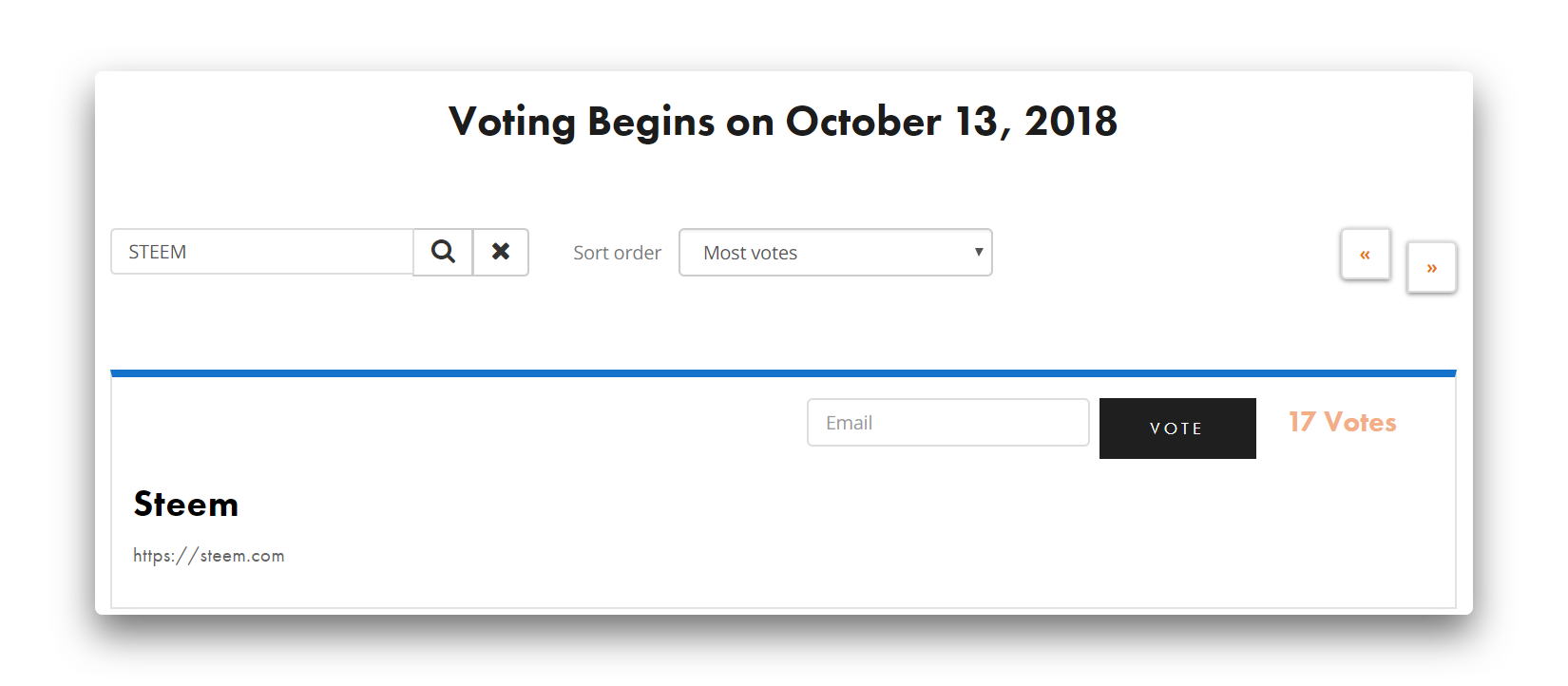 ② ページの一番下(Voting Begins on October)までスクロールし、コインのリストのなかから「STEEM」を検索します。テキストボックスにメールアドレスを入力し、「VOTE」をクリックします。