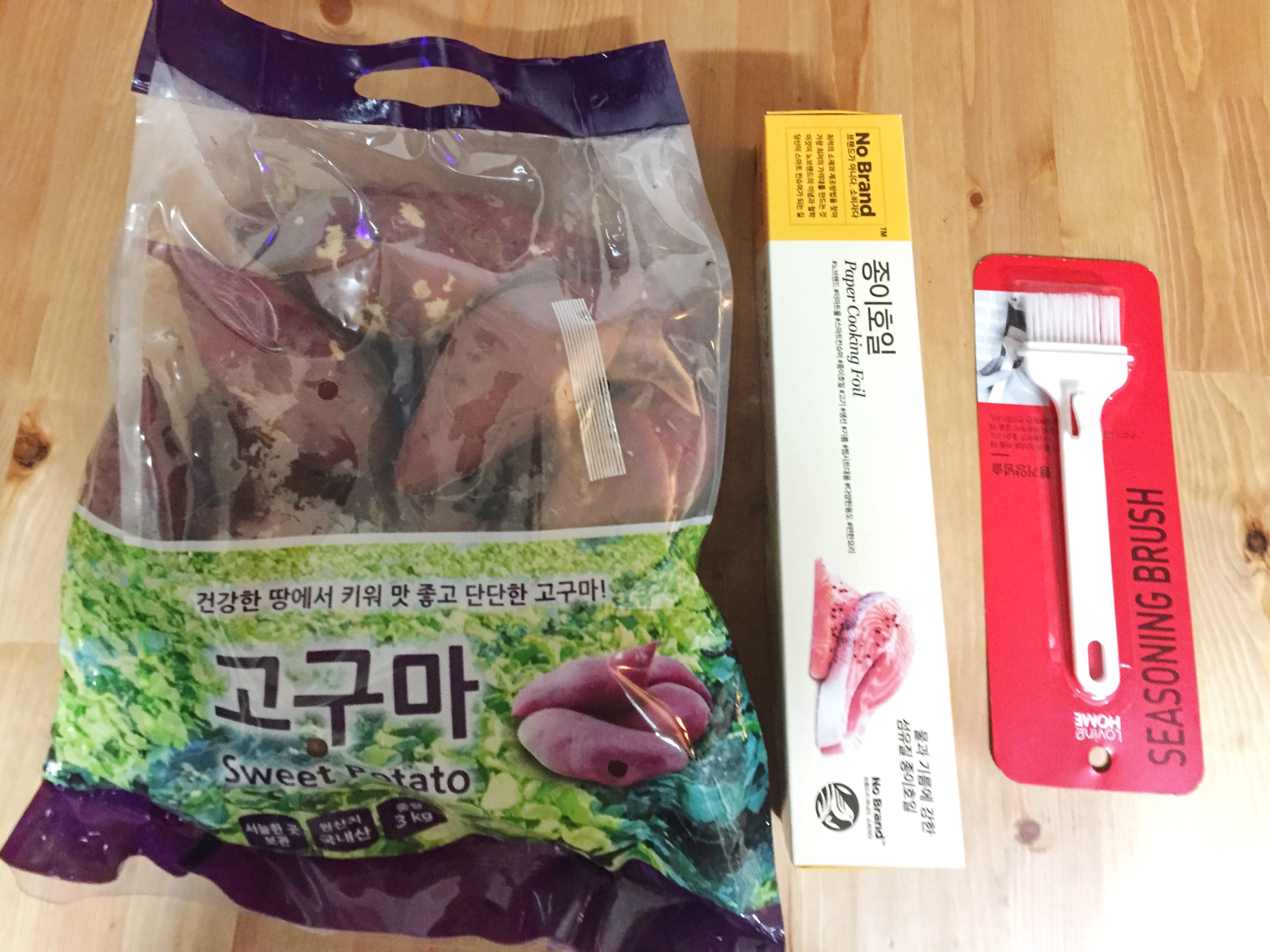 에어프라이어 이용 시 필요하다는 종이호일과 오일을 바를 브러쉬, 그리고 군고구마를 만들어보기 위해 고구마를 한 봉지 사왔습니다.