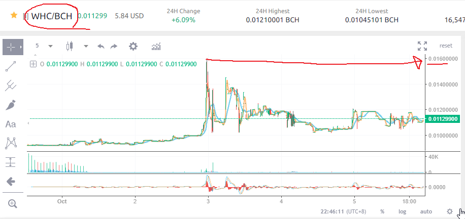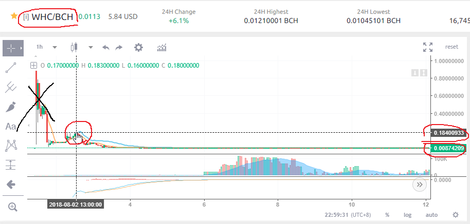 1 BCH = 100 WHC ,즉 1 WHC = 0.01 BCH 에 패깅 된 코인이라 봐도 무방한데.. 아래 사진을 보면 알겠지만 너무나 아이러니하게도 WHC가 마켓에 올라온 직후 시점의 비 정상적인 가격을 차치해 주고서라도 0.18을 넘나들며 가격이 유지된 저력이 있습니다.