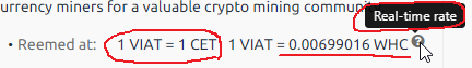 우선 1VIAT = 1CET , 즉 CET 의 시장가격에 상관없이 1:1 로 VIAT 를 지급합니다. 하지만 WHC는 0.00699016 WHC 라는 애매한 가격을 제시합니다. 이것은 현재(실시간 시세반영) 1CET = 0.00699016WHC 이란 뜻입니다.