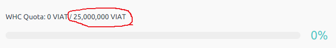 WHC로 참여할 수 있는 최대 수량은 2천5백만개 VIAT 입니다. 현재가 1VIAT= 0.00699WHC로는 전체 250,000개의 WHC로 (25,0000 whc / 0.00699 whc = 35765379.1130186 ) 최대 3천 5백만개의 VIAT 를 구입(ICO참가)할 수 있겠네요.. 하지만 max 가 2천 5백만개이니 현재가의 WHC로 모든 VIAT를 구입해도 (25,000,000 VIAT * 0.00699 WHC) 174,750개의 WHC만 필요합니다. VIAT에 참여한 WHC 를 빼고 75,000여개의 WHC는 남게 되겠네요.