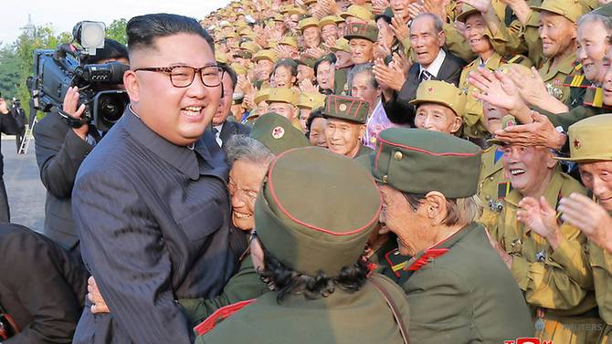 북한의 김정일 국방 위원장은 2018 년 7 월 27 일 북한 중앙 통신 (KCNA)이 발표 한이 사진에서 제 5 차 전국 참전 용사 회의에 참석했다.