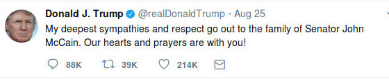 How small and petty the President of the United States seem to the world in the wake of this Senator's death. Everyone watching is stunned by the actions of this president. He couldn't even bring himself to send out condolences to the family of this man that was such a hero to his country, and to so many people all over the world. He sacrificed so much for the country that he loved. He was beloved by many and hated by few, sympathizers from near and far sent their condolences but it took quite a while before the President could bring himself to send out a few half baked words, probably because he was told how bad it looked that he didn't even bother. Shame on you Mr President, it doesn't matter if you never got along in life, for God's sake the man is gone, no one should have to prompt you to say something nice and genuine about him. It was so childish of you, the way you just sat there with your arms folded, dead silence when asked to say something, it should have been automatic.