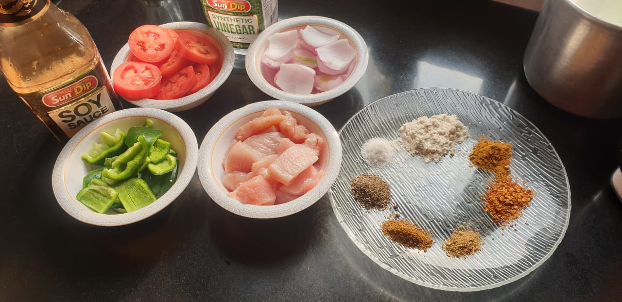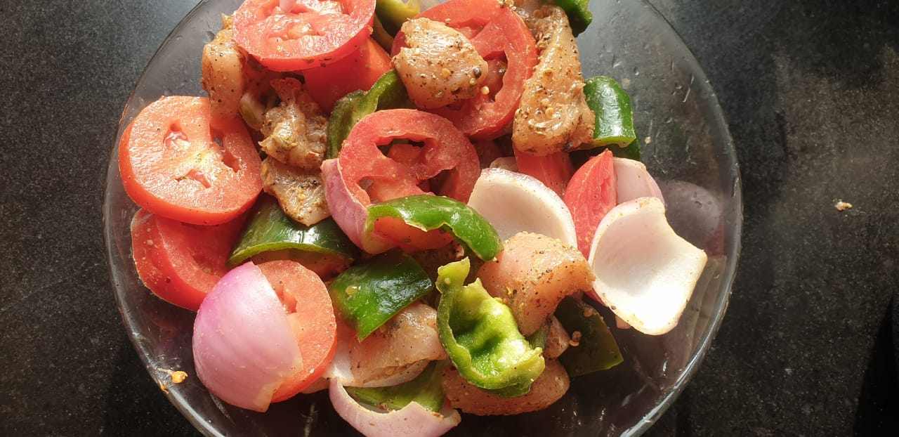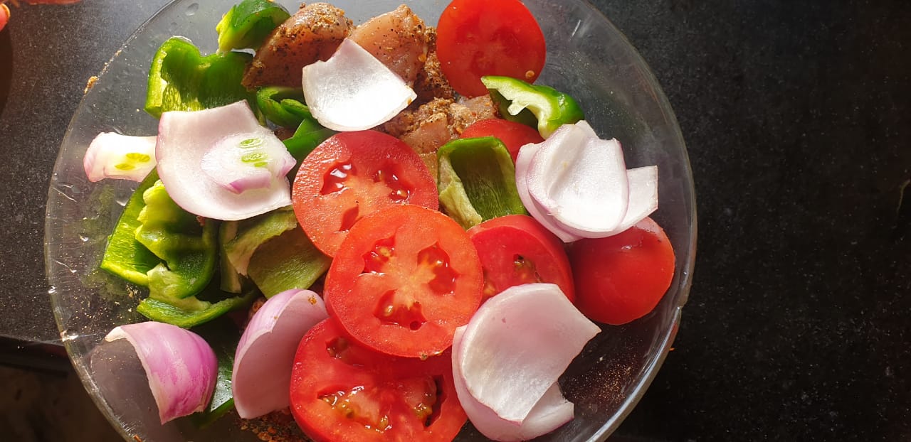 While the chicken was marinating I prepareding the vegetable . I cut onion Capsicum and tomato into medium Size pieces . I use fresh Vegetable because fresh Vegetable give beter taste & Colors.