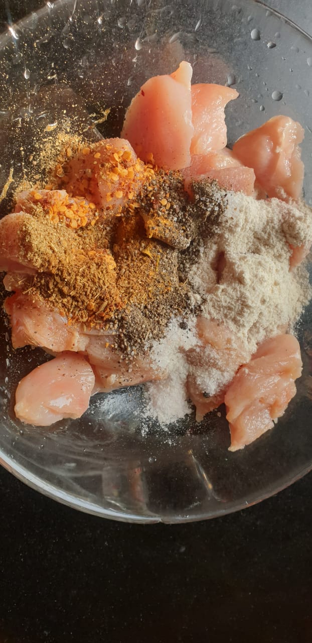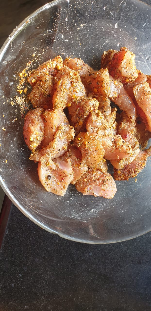 After mixing every thingd well I covering the bowl and left the Chicken to merinated for 15 minutes.