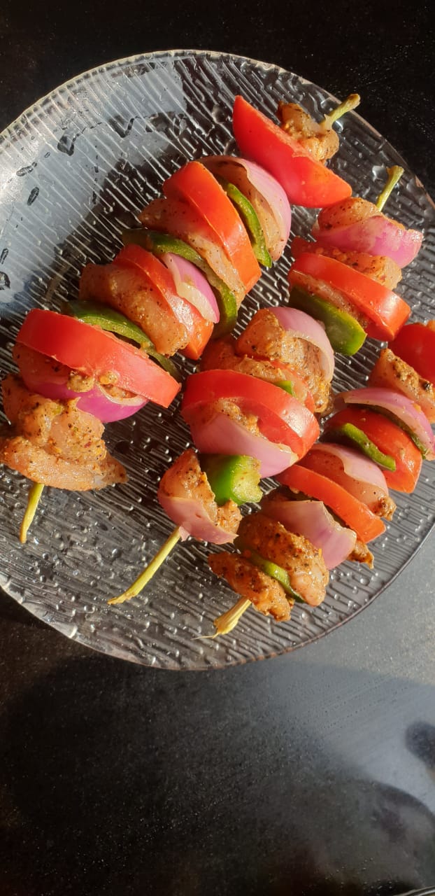 Before using Wood stick I soak them in water so that woulds not burn while frying. Than I places vegetables and Chicken on the Stick one by One. I start with hards vegetables firsts then chicken Onion and Capsicum Again.