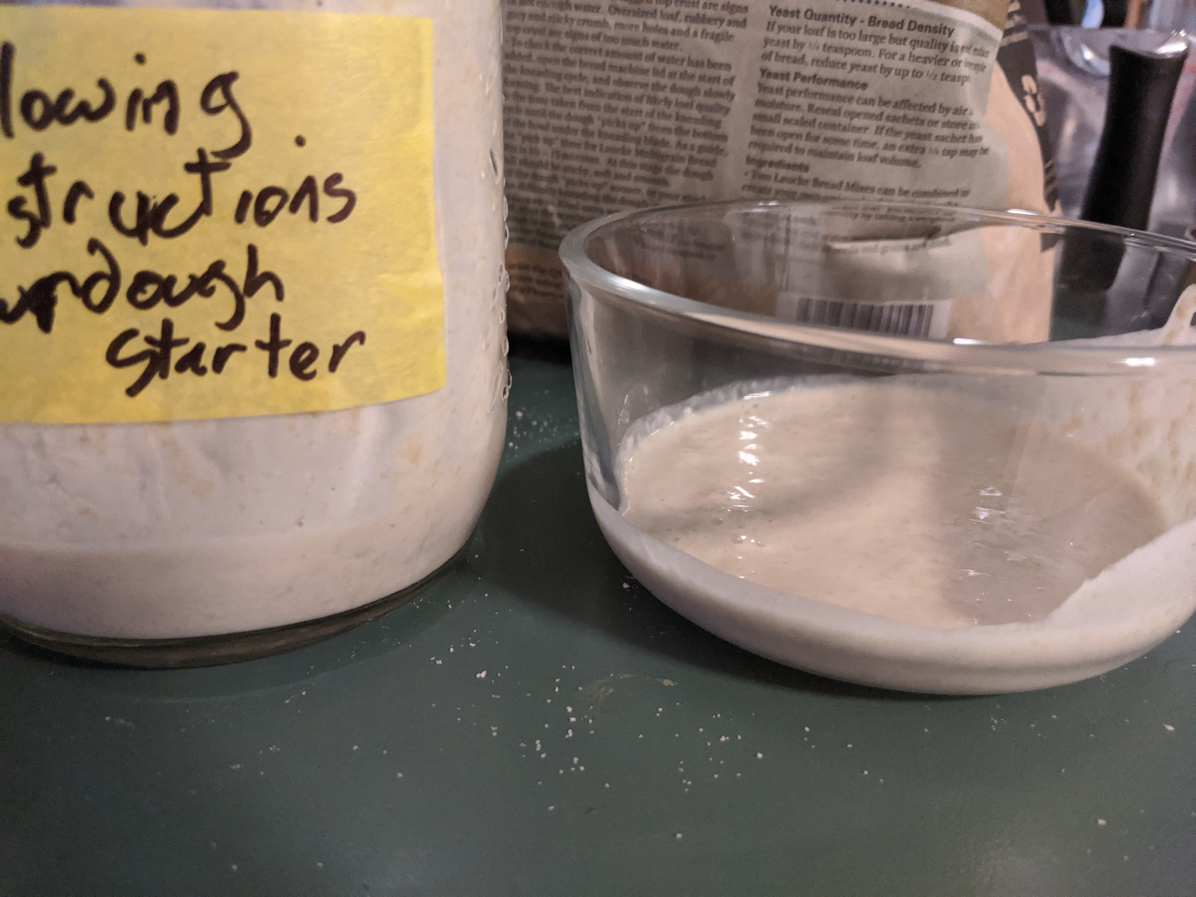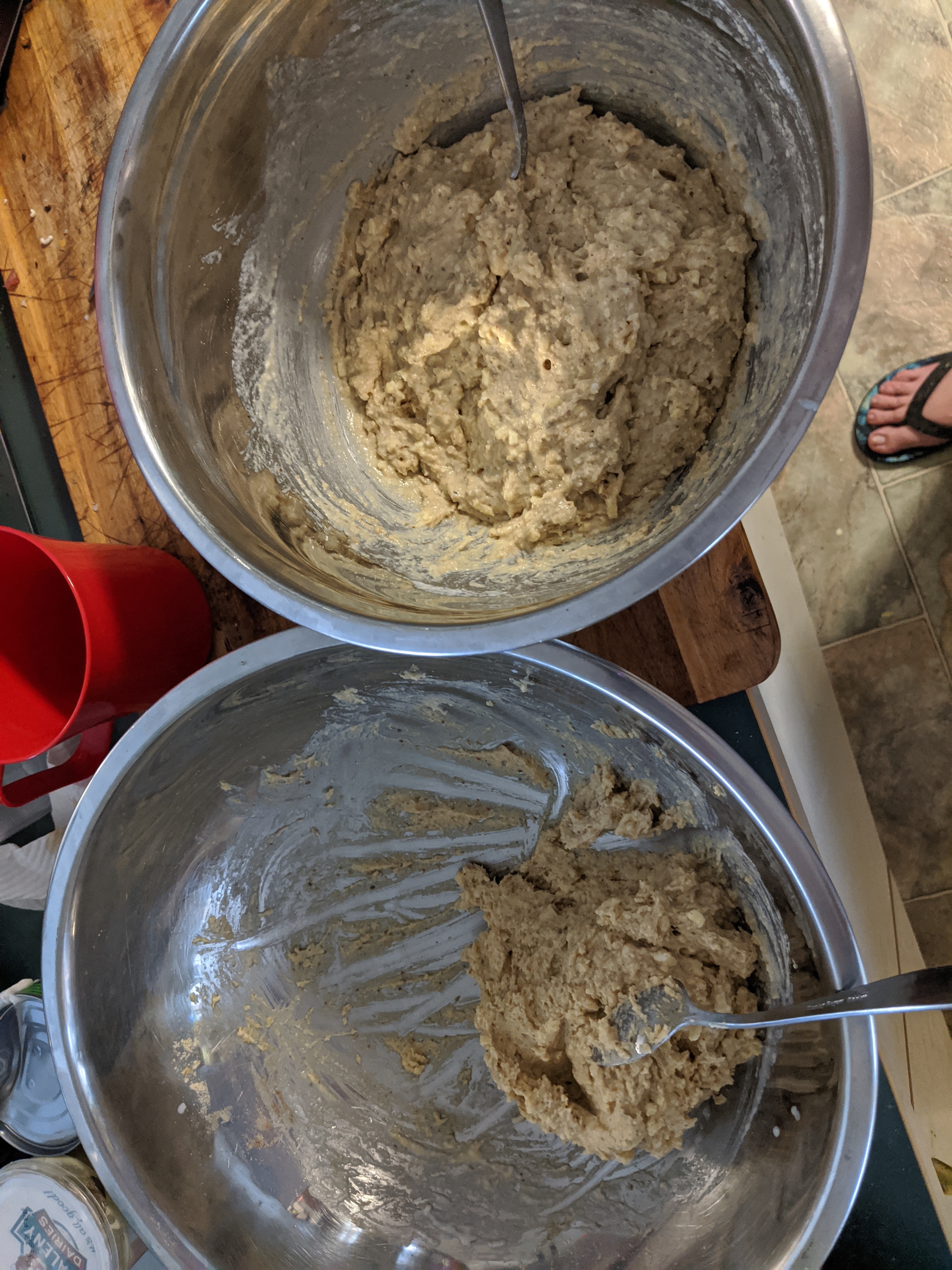 Because I did one-for-one feeds [one quarter-cup of flour also got a quarter cup of water], the resulting harvest from the other two starters was... really goopy.