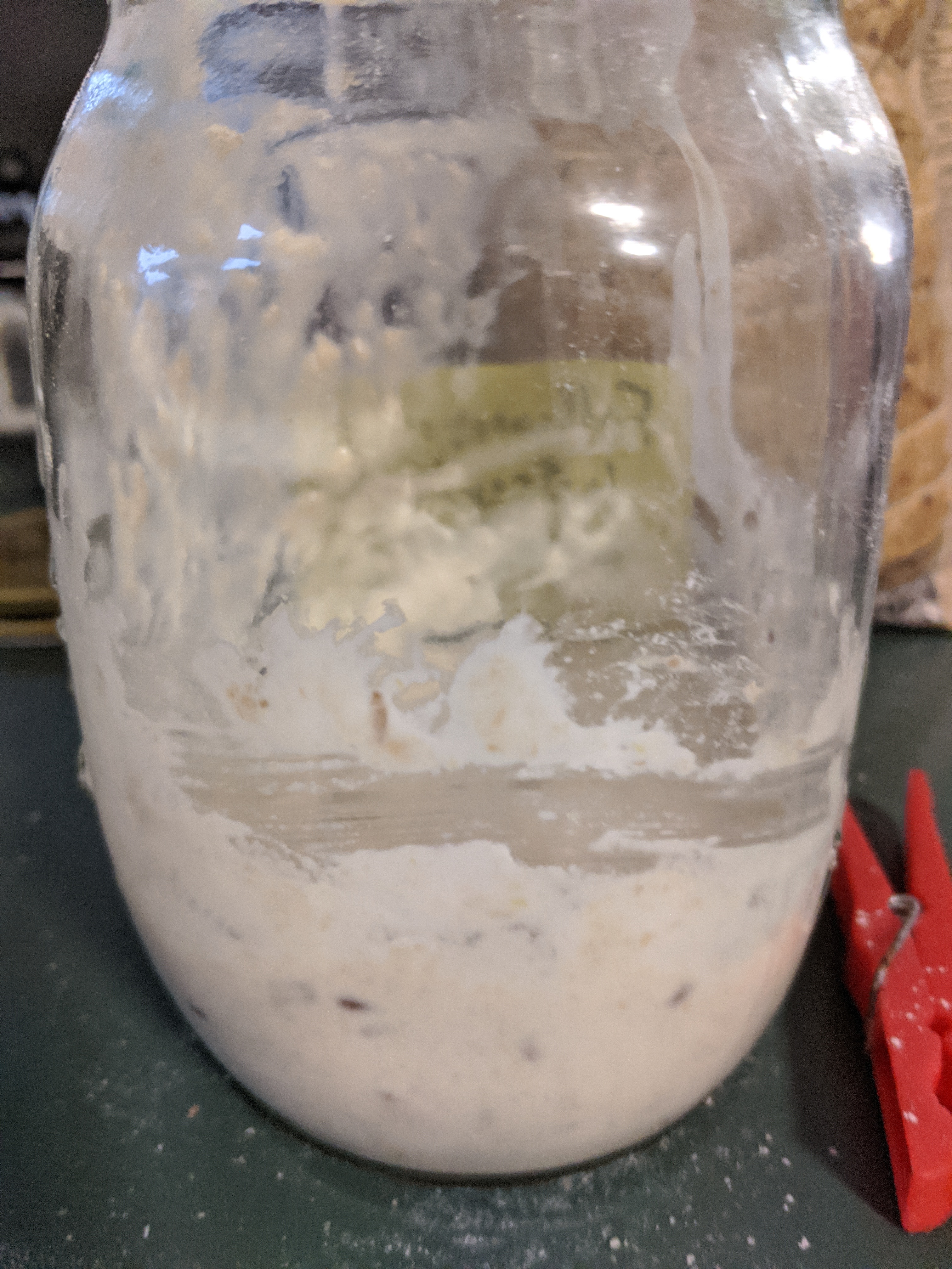 It was at this point that the Almond Starter began generating its own liquid somehow? Maybe it was the rain? Anyway, I fed them with a half cup of the relevant flour and a quarter cup of filtered water. I'm simulating a loose cling-wrap seal by unscrewing the lid a quarter turn and then replacing the paper towel and rubber band over the top.