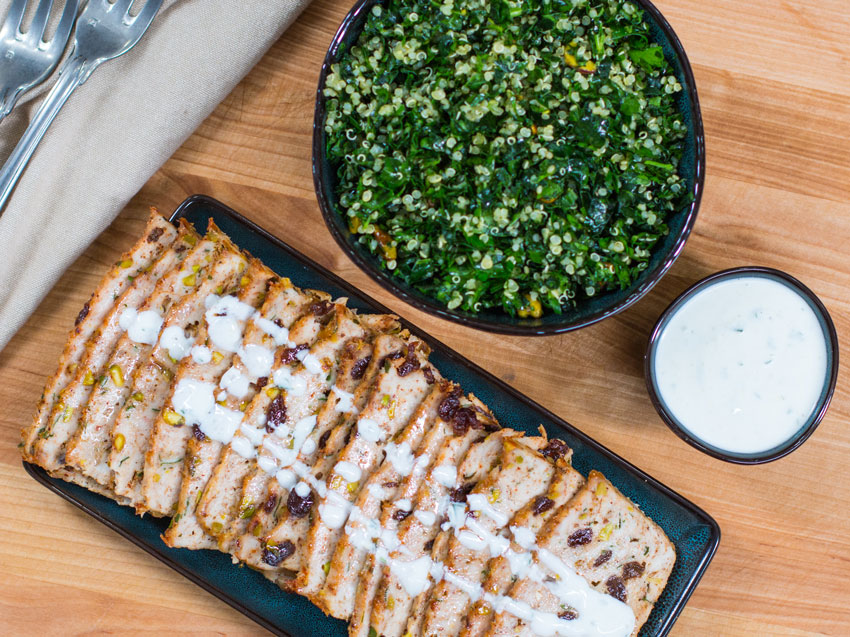 - For the chicken shawarma, pre-heat oven to 350 degrees F. In a large bowl, combine the ground chicken and remaining shawarma ingredients. Use your hands and mix until everything is very well combined. Line a meatloaf tin with parchment paper and pack in the chicken mixture, making sure it’s evenly distributed. If you are not using parchment, oil the inside of the tin, or you can use a sheet tray and free form it like meatloaf. Bake in the oven for 40-45 minutes, or until the internal temperature is 158 degrees F. Remove from oven let cool for 10 minutes.