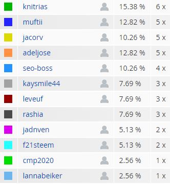 The Members receive support for a four-month period or until they own 500 SP on their accounts. This period could be extended or finished depending on the activities of each Member within the working group. At the moment of reaching the 500 SP goal and becoming a minnow account, the Member becomes a Graduate of the Project. Until now, we have one Graduate Member. A Graduate Member can stay in the Project by delegating 50 SP to the @Knitrias account and continue to support on Fellow Members posts.