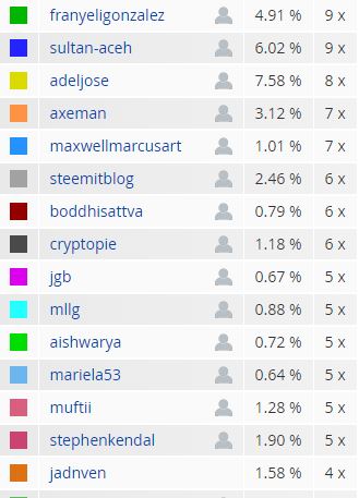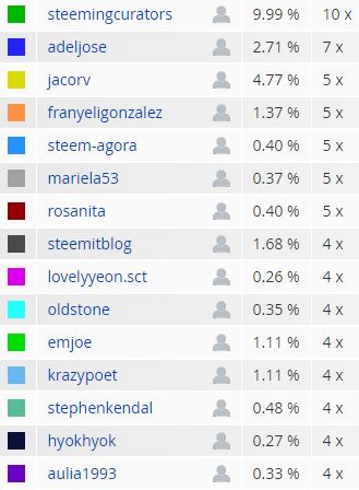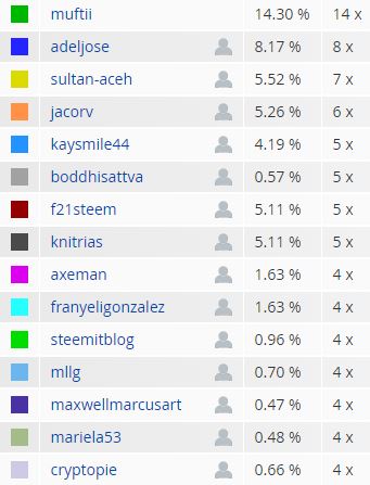 The delegation also allows a cooperative effort consisting in the support between Members setting a ~ 50% of the voting capabilities of each account to distribute between fellow Members of the project. Each Member is entitled to receive votes at 100% from the @Knitrias account on posts and also in comments depending on the voting power of the account each day.