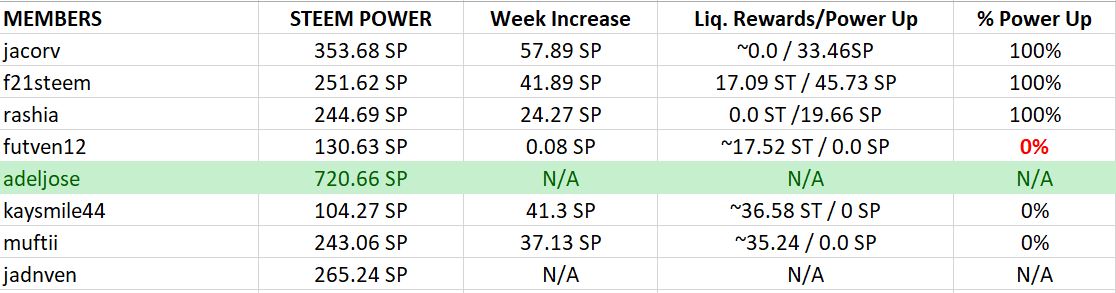 Members are encouraged to Power Up ~ 50% of the liquid rewards from their posts. This is aimed to contribute in the faster growth of the own account, but it has been flexible depending on the Members' knowledge on the operations of the platform and also different needs on the use of each one funds. The Power Up strategy will be constantly encouraged but finally will be responsibility of each user to balance personal and group goals.