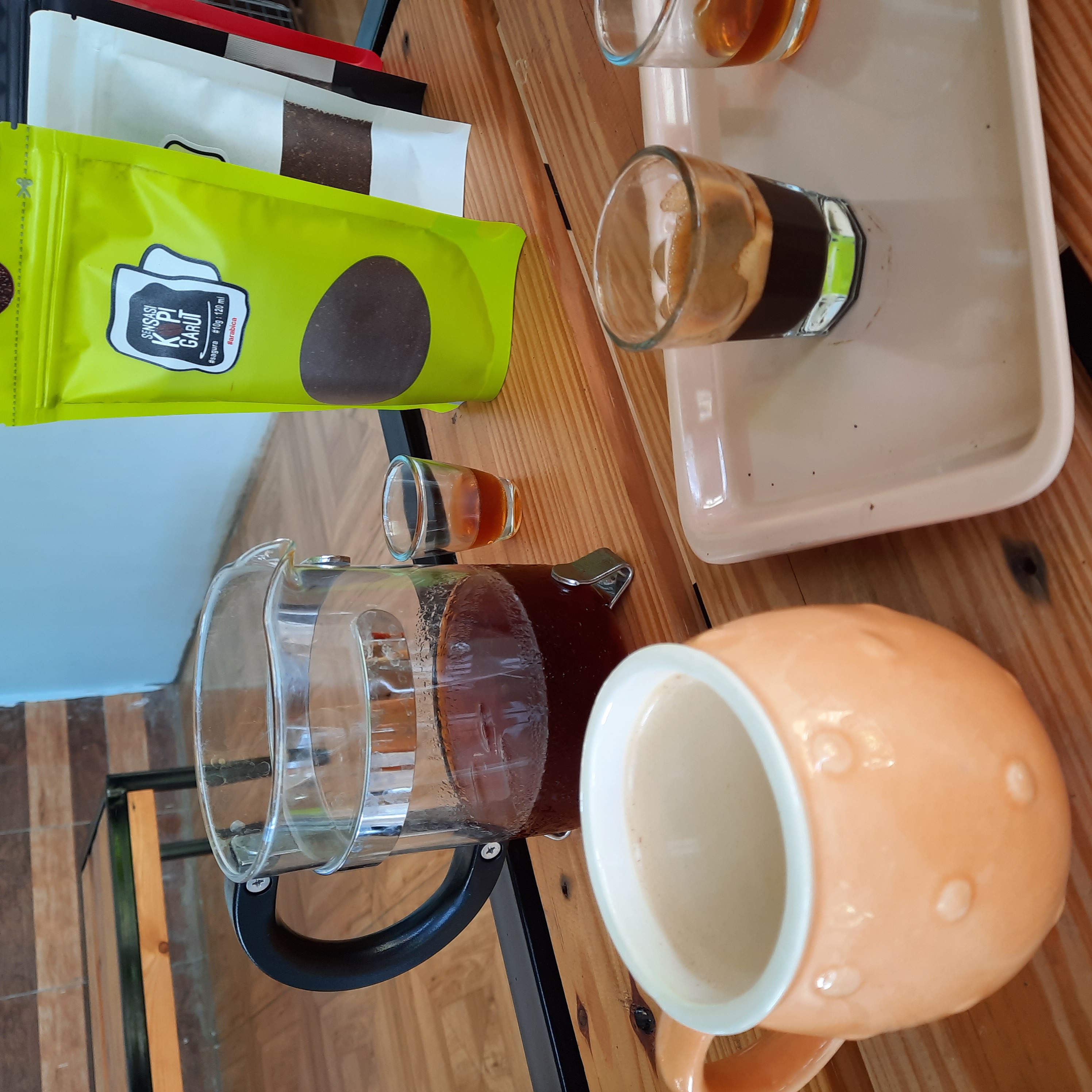 Untung wine coffee cuma satu sloki, espresso juga. Cuma kopi susu gula aren yang satu mug.