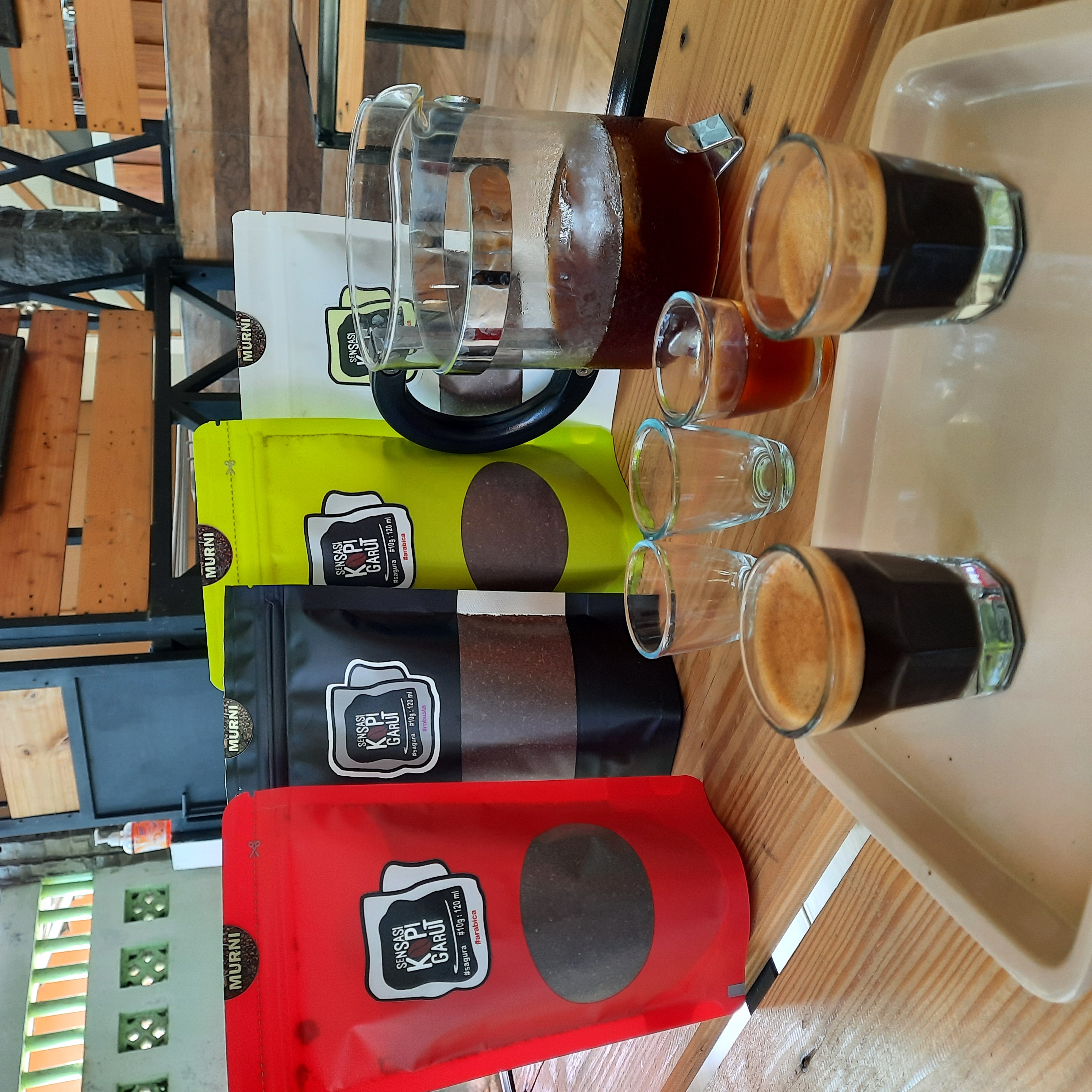 Mentang-mentang lama tak jumpa, disuguhi 3 macam kopi: wine coffee, espresso, dan kopi susu gula aren.