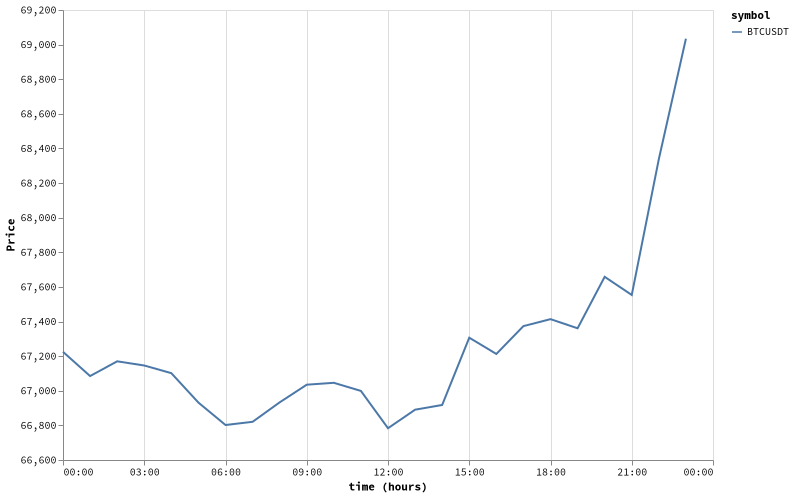 하루 중 가장 낮은 가격은 05시의 66,931.65$였으며, 가장 높은 가격은 23시의 69,034.18$였습니다.
