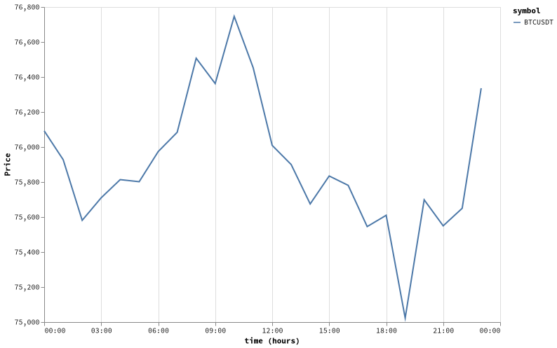 하루 동안의 거래량도 유의미한 변화를 보였습니다. 특히, 7시에서 8시 사이에 가장 높은 거래량인 1,236.72가 기록되었으며, 이때의 가격은 76,084.34$에서 76,507.21$로 상승했습니다. 이는 시장의 활발한 거래 활동이 가격 상승에 영향을 미쳤을 가능성을 나타냅니다. 반면, 21시에는 거래량이 249.38로 가장 낮았고, 이때의 가격은 75,549.99$로 비교적 안정적이었습니다.