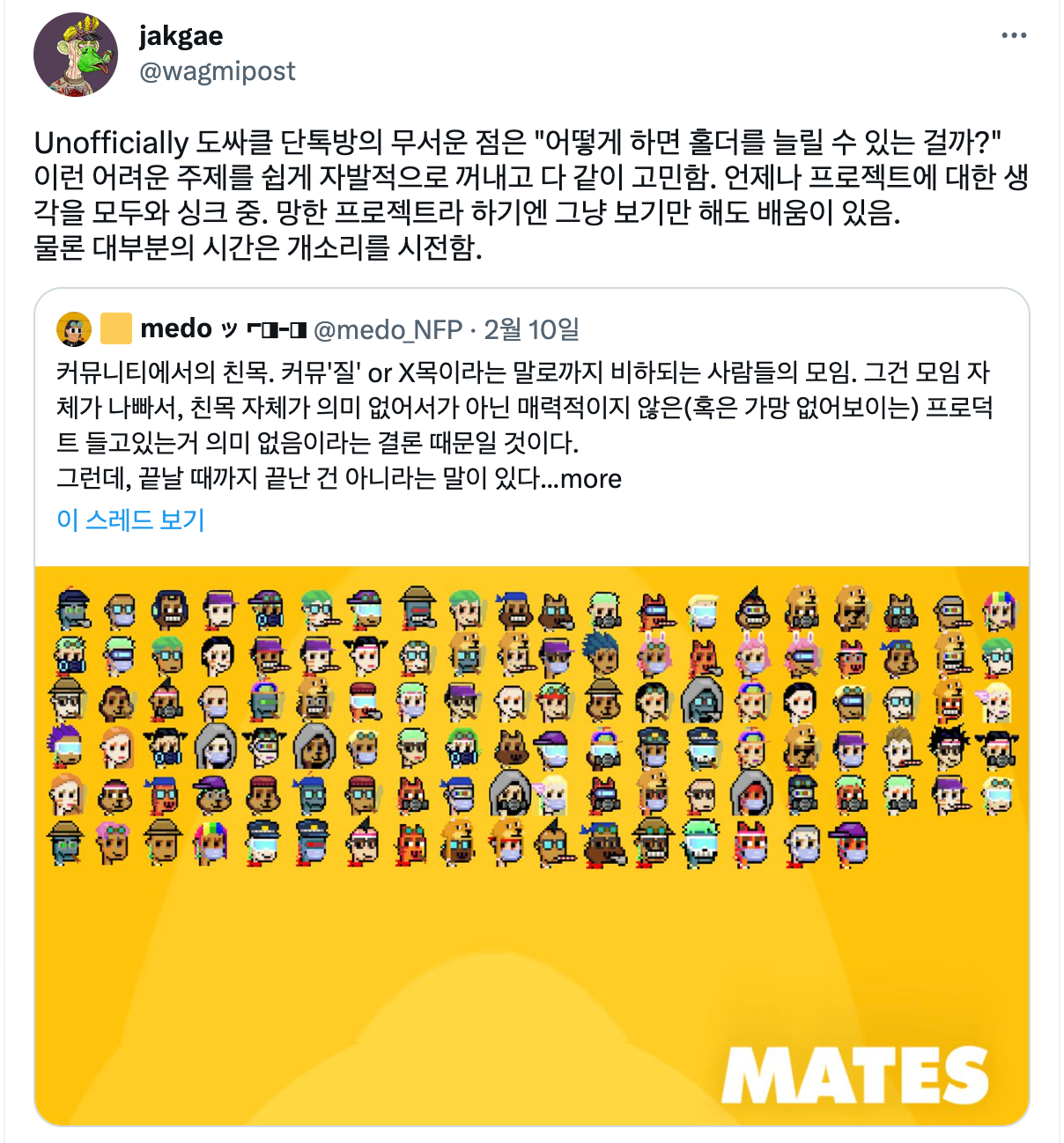 여전히 메이트를 홀딩하고 있는 메이트 홀더, 깐부들을 다시 찾아보자. 홀더로서, 비공식 오픈 카카오톡방을 생성하기로 결심했다(도사클 부흥기에 오징어게임이 유행하면서 도사클 홀더들끼리 깐부라고 부르는 문화가 있었다). 여전히 Web 3.0 신에서 다양한 모습으로 활동하고 있는 깐부들, 트위터에서 메이트 홀더 인증이었던 노랑딱지를 아직도 붙이고 있는 사람들.