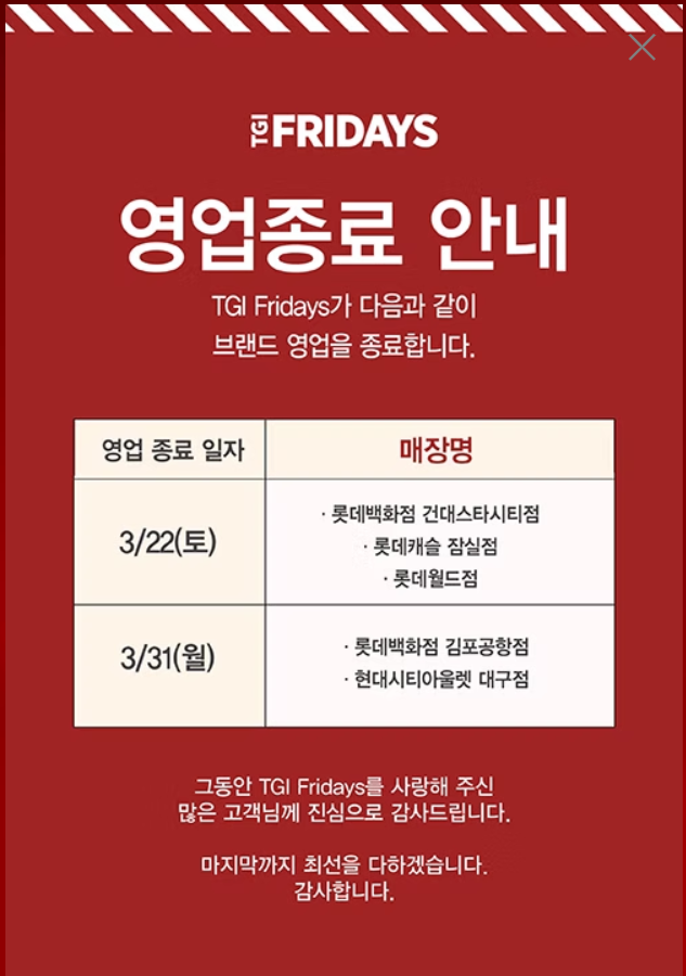 TGI Fridays 영업 종료