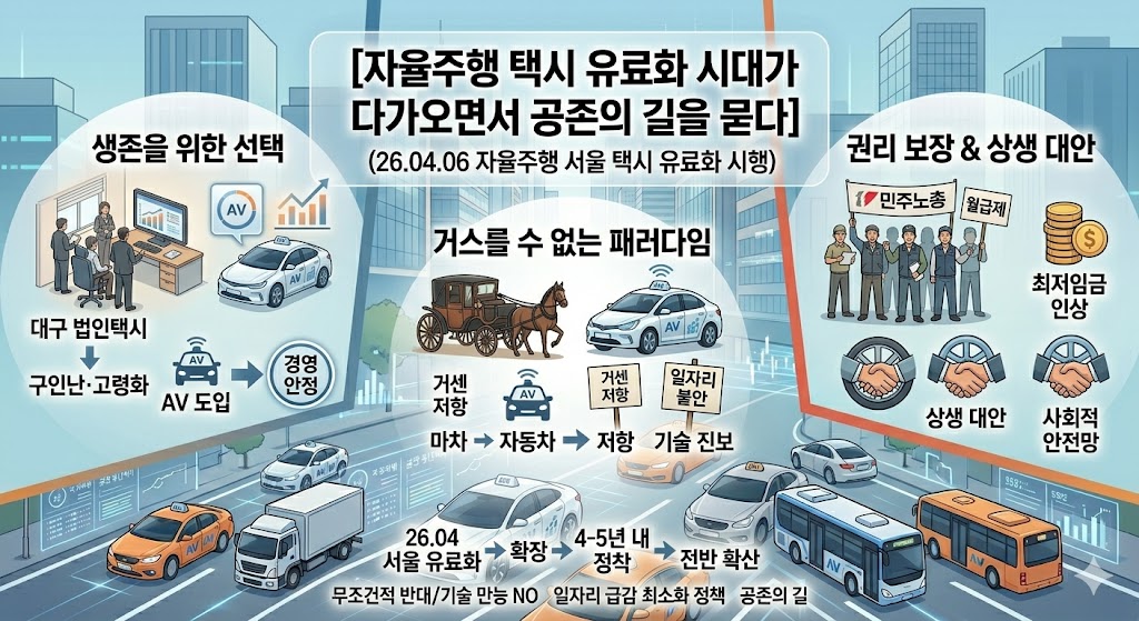 제목:자율주행 택시 유료화 시대가 다가오면서 공존의 길을 묻다 (26.04.06 자율주행 서울 택시 유료화 시행)