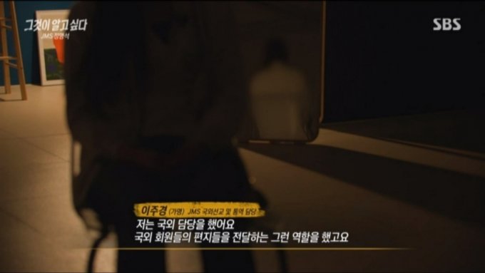 이에 A씨는 그것이 알고 싶다 제작진과 인터뷰를 통해 "JMS에서 국외 담당을 했던 게 맞다"며 "국외 회원들의 편지를 (정명석에게) 전달하는 역할을 맡았다"고 털어놨다.