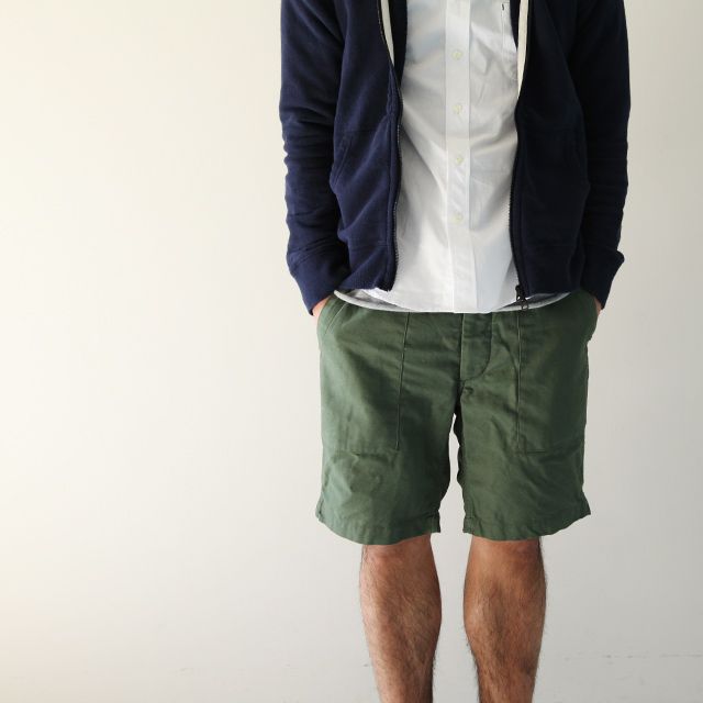 포켓이 아웃라인으로 부착된 게 특징인 퍼티그 쇼츠는 아메카지 느낌을 연출하기 좋다.