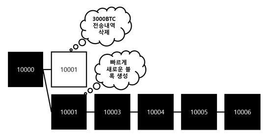 A회사가 악의적인 마음을 품고 얼른 10001번째 블록에 담긴 3000BTC의 송금내역을 삭제합니다.