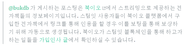 (2) 스팀잇에 전자책 카탈로그를 만들고, 위의 글처럼 특정 내용을 링크로 공유하는 경우, 현재 진행중인 스팀 계정 연결 기능을 통하여, 해당 인용을 댓글로 포스팅하고 이를 보팅하는 서비스가 진행될 예정입니다. 이는 저희 플랫폼 기능을 활용한 공유기능에 대해 스팀 블록체인을 이용하여 보상하는 방법입니다. 현재 전자책 카탈로그 작업은 북이오에 등록되는 전자책의 속도에 맞추어 진행되고 있습니다. 예전에는 하루 10번 포스팅이였으며, 등록 전자책이 많아지면서 하루 24회로 늘려서 포스팅하고 있습니다.