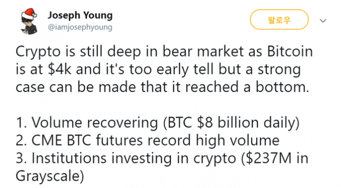 유명 암호화폐 애널리스트 조셉 영(Joseph Young)이 본인의 트위터에서 비트코인의 가격이 여전히 4000달러 수준이지만 암호화폐 시장이 바닥에 도달했다고 볼 수 있는 강력한 징조들이 나타나고 있다고 주장했다.
