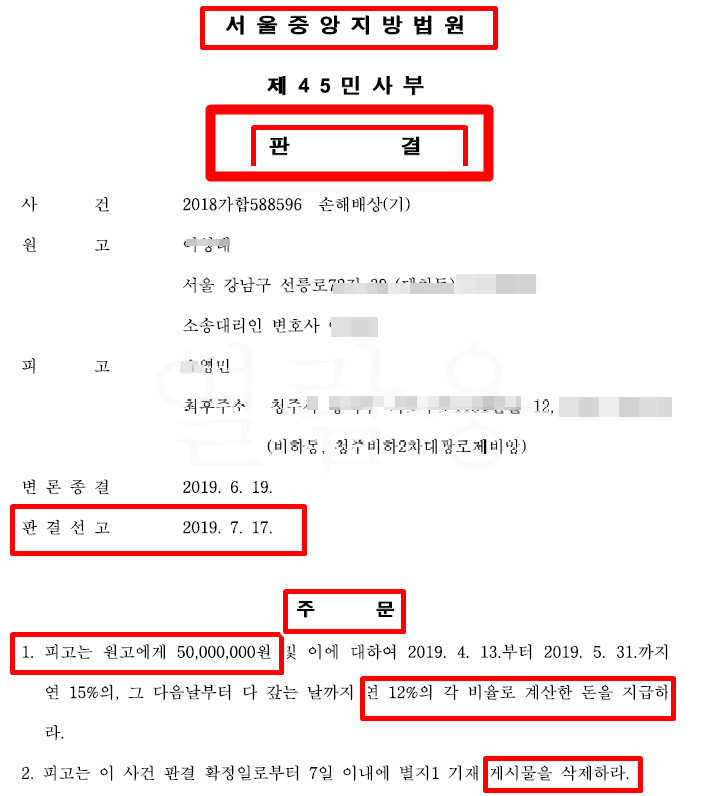 법원은 아래와 같이 배상 판결하였습니다(승소)!