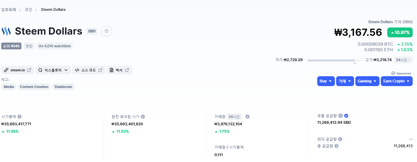 오늘의 Steem Dollars 실시간 가격은 ₩3,167.56 KRW이며 24시간 거래량은 ₩3,962,413,936 KRW입니다. SBD 대 KRW 가격을 실시간으로 업데이트합니다. Steem Dollars은(는) 지난 24시간 동안 10.94 상승했습니다. 현재 코인마켓캡 순위는 #545위이며, 실시가총액은 ₩35,693,401,820 KRW입니다. 순환 공급량은 11,268,413 SBD코인입니다 및 최대 공급량을 이용할 수 없습니다