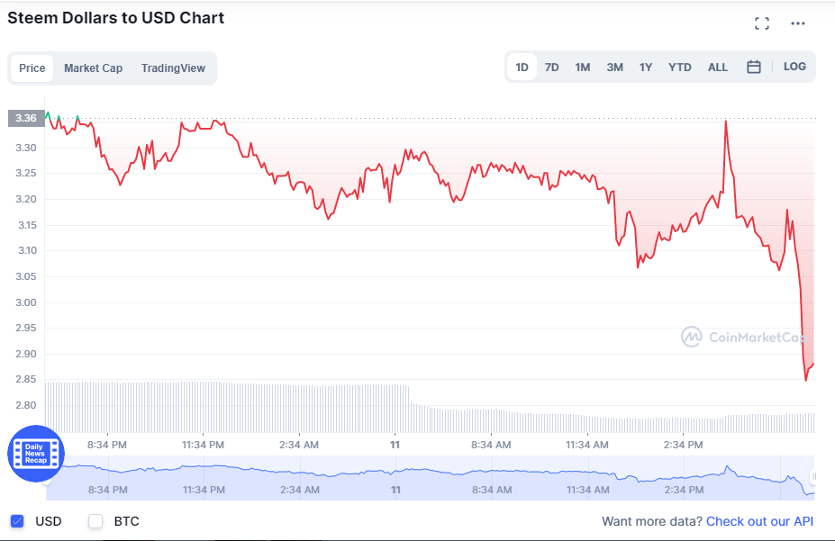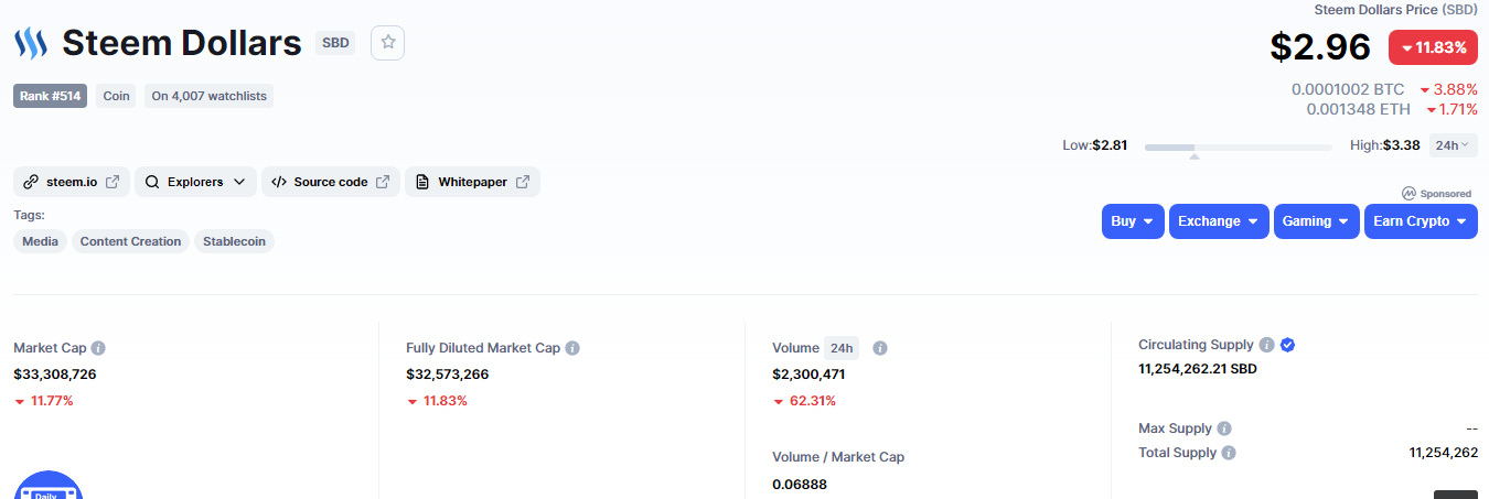 현재 실시간 Steem Dollars 시세는 $2.89 USD이며 24시간 거래량은 $2,243,600 USD입니다. 실시간으로 SBD를 USD 가격으로 업데이트합니다. Steam Dollars는 지난 24시간 동안 13.98% 하락했습니다. 현재 CoinMarketCap 순위는 #514이며 라이브 시가 총액은 $32,573,266 USD입니다. 현재 유통량은 11,254,262 SBD 코인이며 최대 발행량입니다. 공급이 불가능합니다.