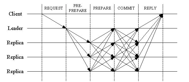 아래 그림은 PBFT 합의 알고리즘의 도식도입니다. PBFT 기반 합의 알고리즘은 비잔틴 장애를 극복하기 위해 합의 결과를 네트워크의 모든 노드에 2번에 걸쳐 전파하기 때문에 많은 통신량으로 인한 성능 저하가 일어날 수 있습니다.