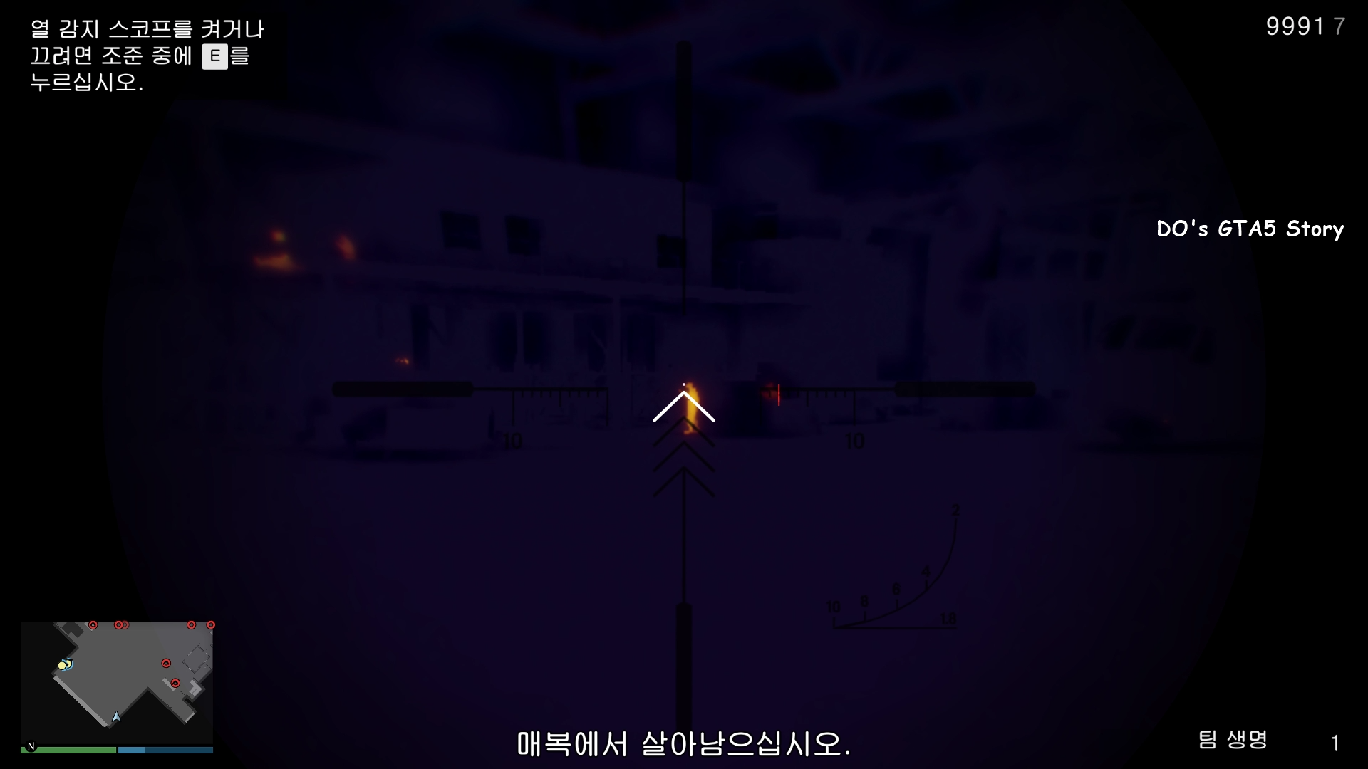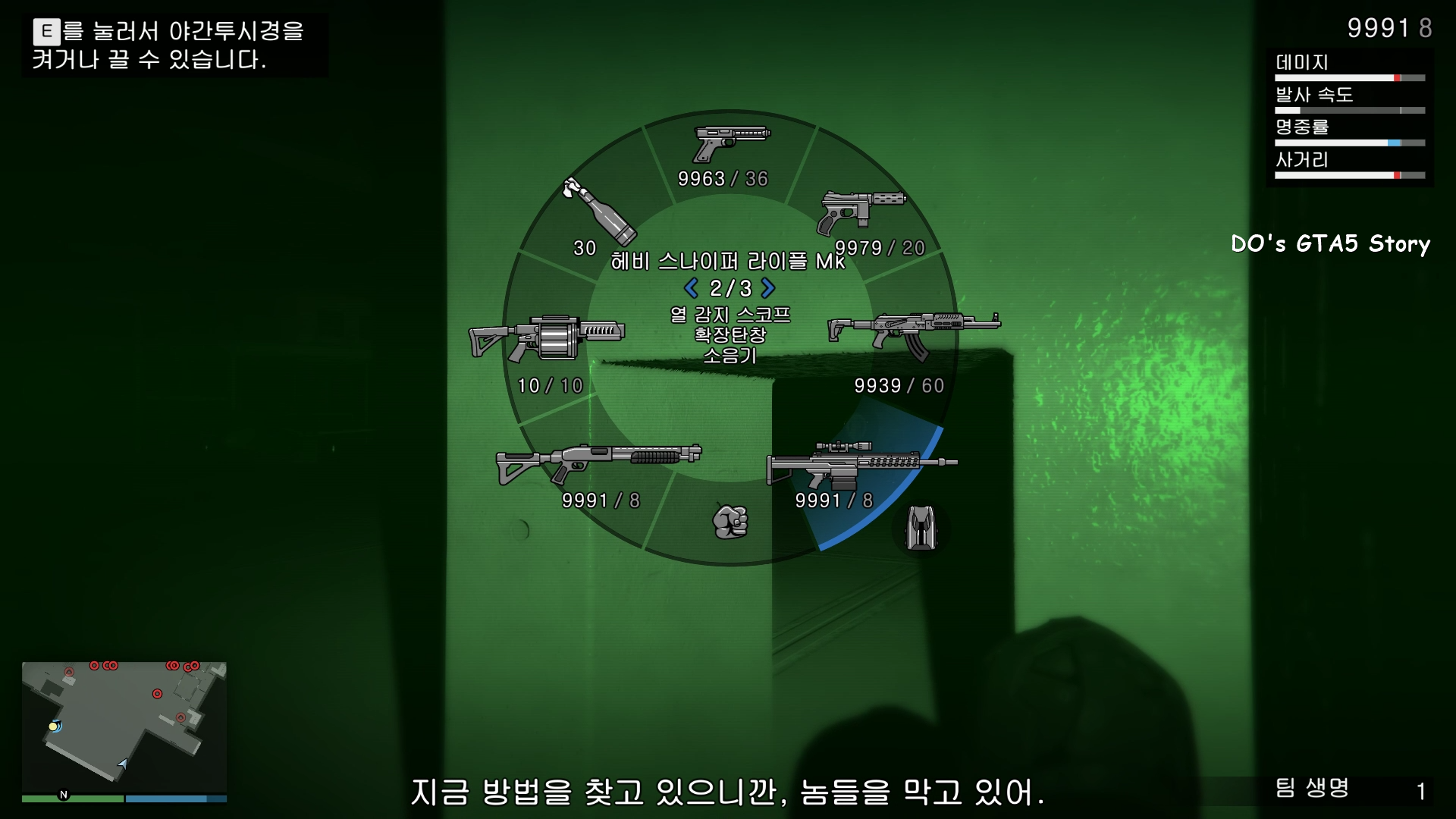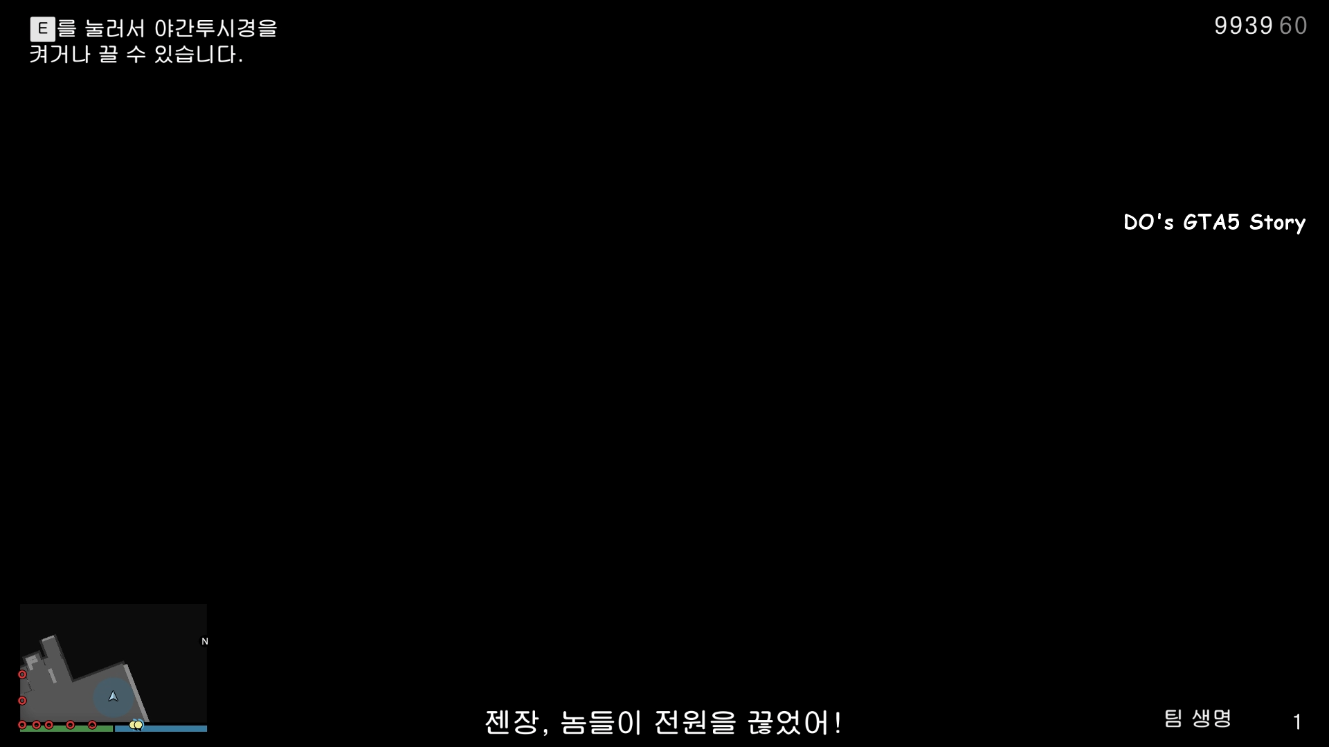 그치만 좌측 상단을 보시면 E키를 눌러서 야간투시경을 켜거나 끌수 있다는 메시지가 나옵니다.