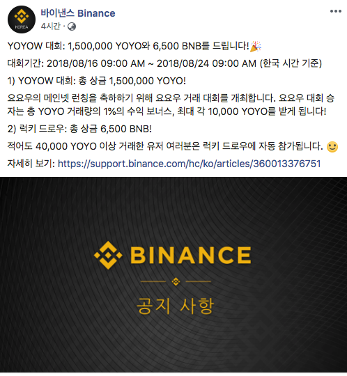 바이낸스 YOYOW 토큰 1,500,000 YOYO 에어드랍 이벤트 있다고 하네요glenjo (25)in #kr • 8 years ago 바이낸스에서 YOYOW에어드랍 이벤트 한다고 하네요 요즘같은 암울한 시기에 쏠쏠한 재미 되시라고 올려봅니다 https://www.facebook.com/BinanceKorean/photos/a.2042271766090293.1073741828.2015415575442579/2089522514698551/?type=3