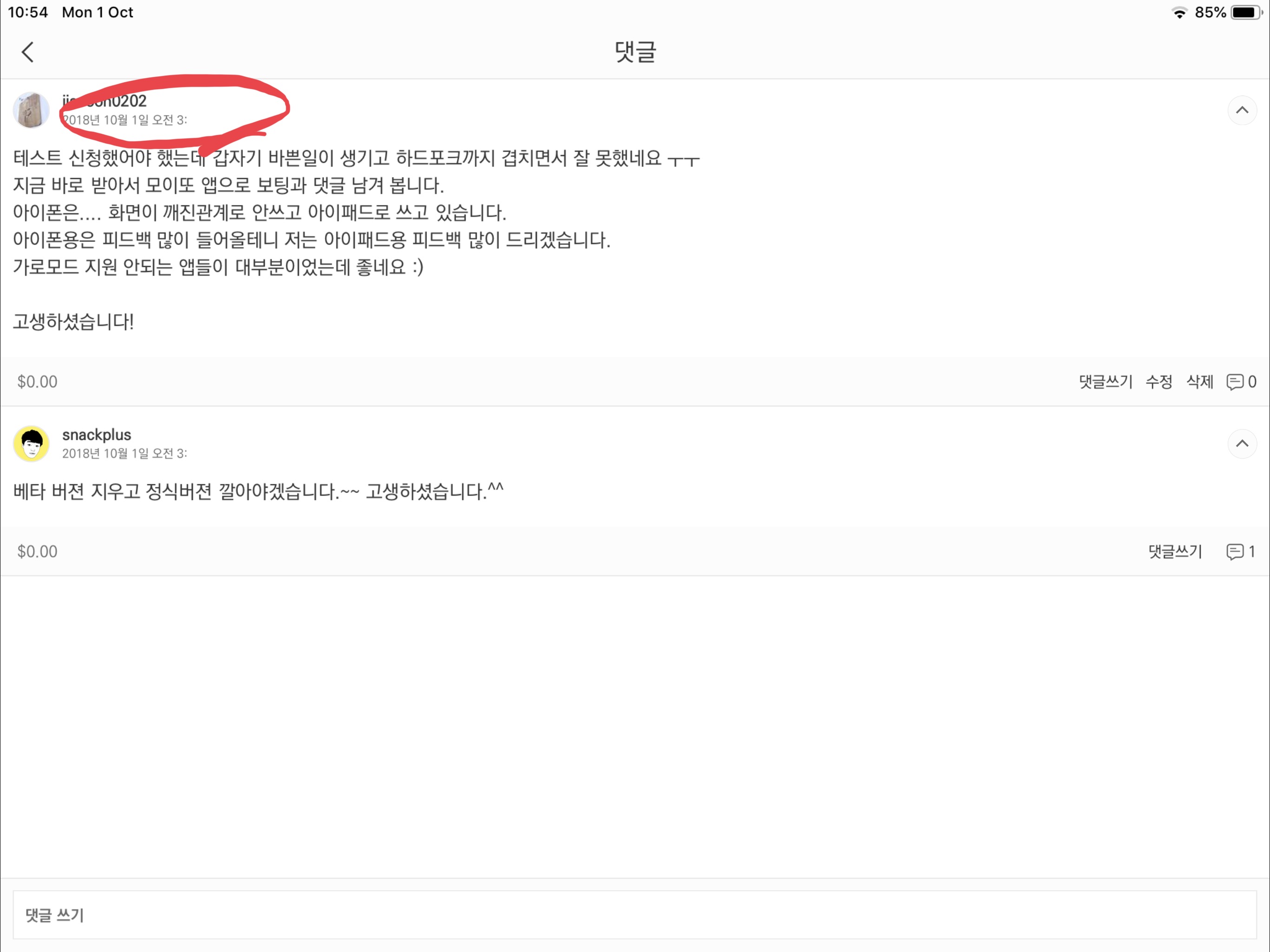 아, 아이패드 버전이군요! 개발팀에 얼른 제보하겠습니다.