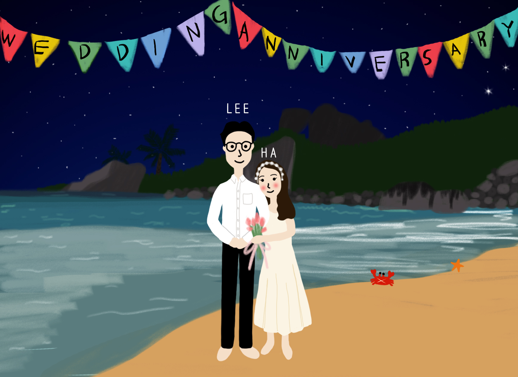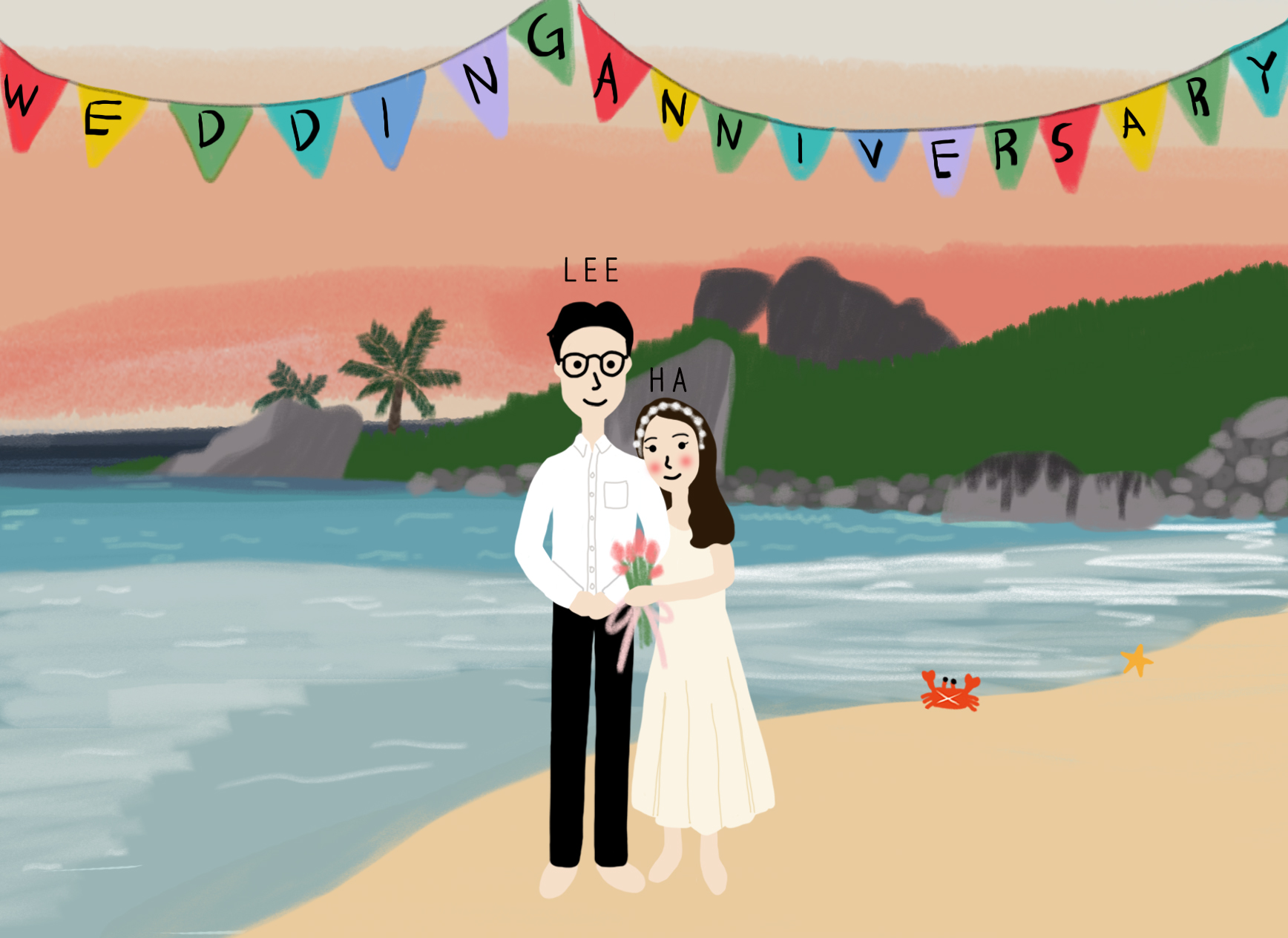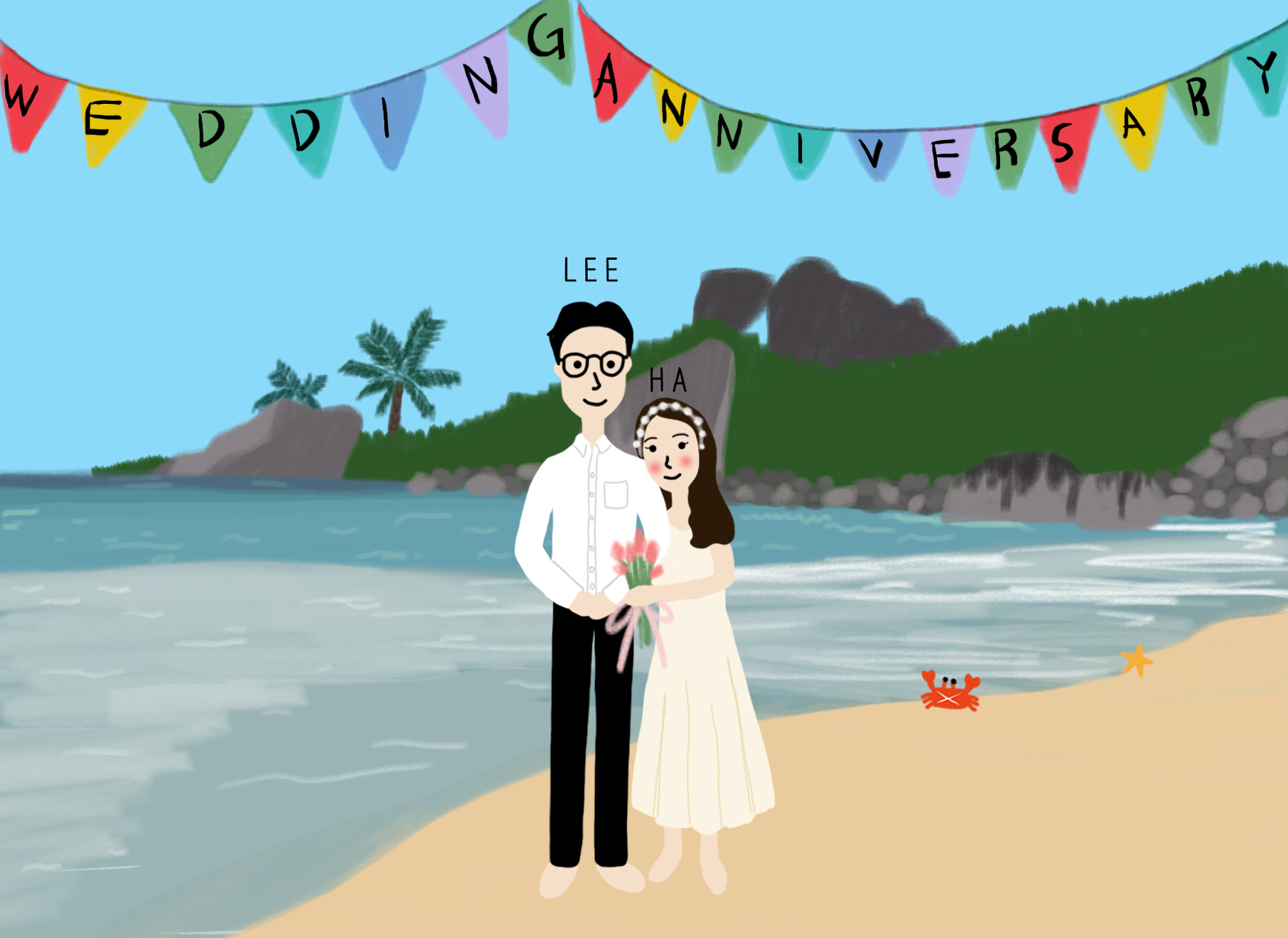 돌과 나무, 해변이 예쁘게 어우러져 있는 배경을 쓱싹쓱싹 그리고 가운데 다정한 포즈의 두분을 그려 넣은 다음 귀여운 게와 불가사리를 오른쪽에 배치했습니다.