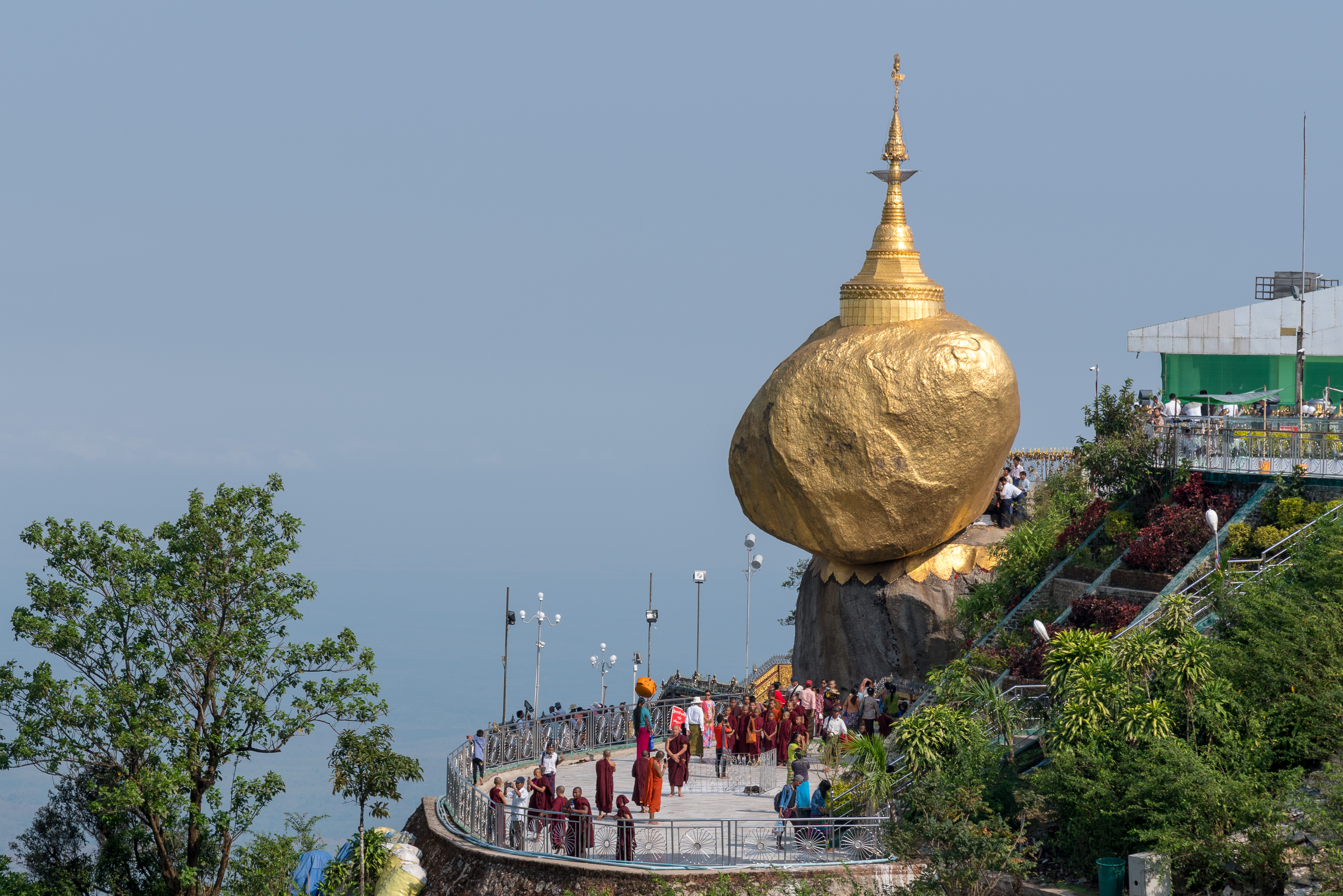 마지막 세 번 째 파고다는 황금바위(Golden Rock)라고도 불리는 짜익티요 파고다입니다. 위태롭게 걸쳐져있는 황금바위 위에 작은 불탑을 세워두었습니다만 부처님 머리카락의 영험한 힘으로 굴러 떨어지지 않는다고 전해집니다.