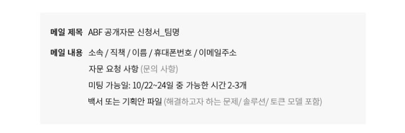 프로젝트 공개 자문을 희망하시는 팀은 10월 18일까지 아래 사항을 포함하여 advisor@tokenomia.com으로 신청메일을 보내주시기 바랍니다. 신청팀들 중 최종 선발된 팀들에게는 10월 19일(금)까지 개별연락을 드릴 예정입니다.