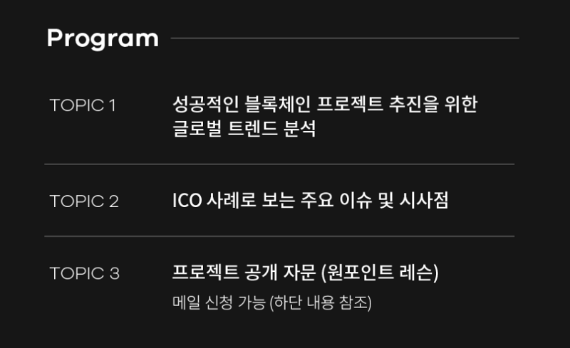 업계 관계자 등 해당 내용에 관심있는 많은 분들의 참석을 바라며, 아울러 이번 행사 중 마지막 세션으로 ICO 프로젝트들을 선발하여 공개 자문을 진행하오니 관심있는 팀들은 자세한 내용을 쭉 확인해보시기를 권장드립니다.