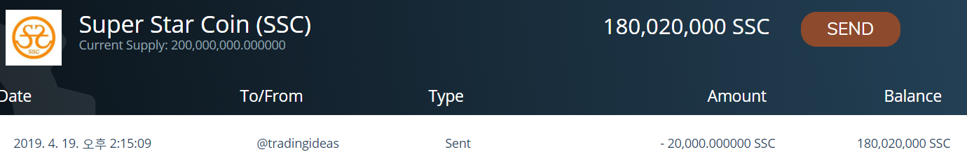 현재 @tradingideas 계정에는 180,020,000 SSC가 있으며, 이 중 20,000 SSC는 SSC에 많은 도움을 주실 한 분에게 판매할 계획입니다. 그리고 나머지 180,000,000 SSC는 향후 실세계 비지니스가 나올 때 까지 lock-up 물량입니다.
