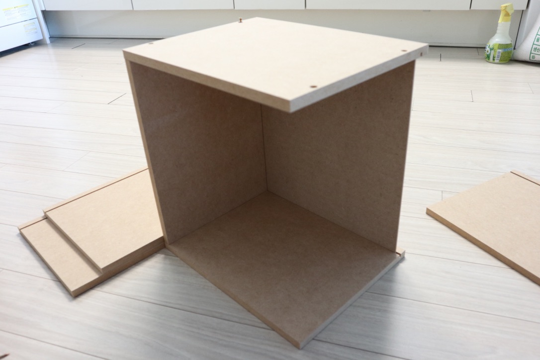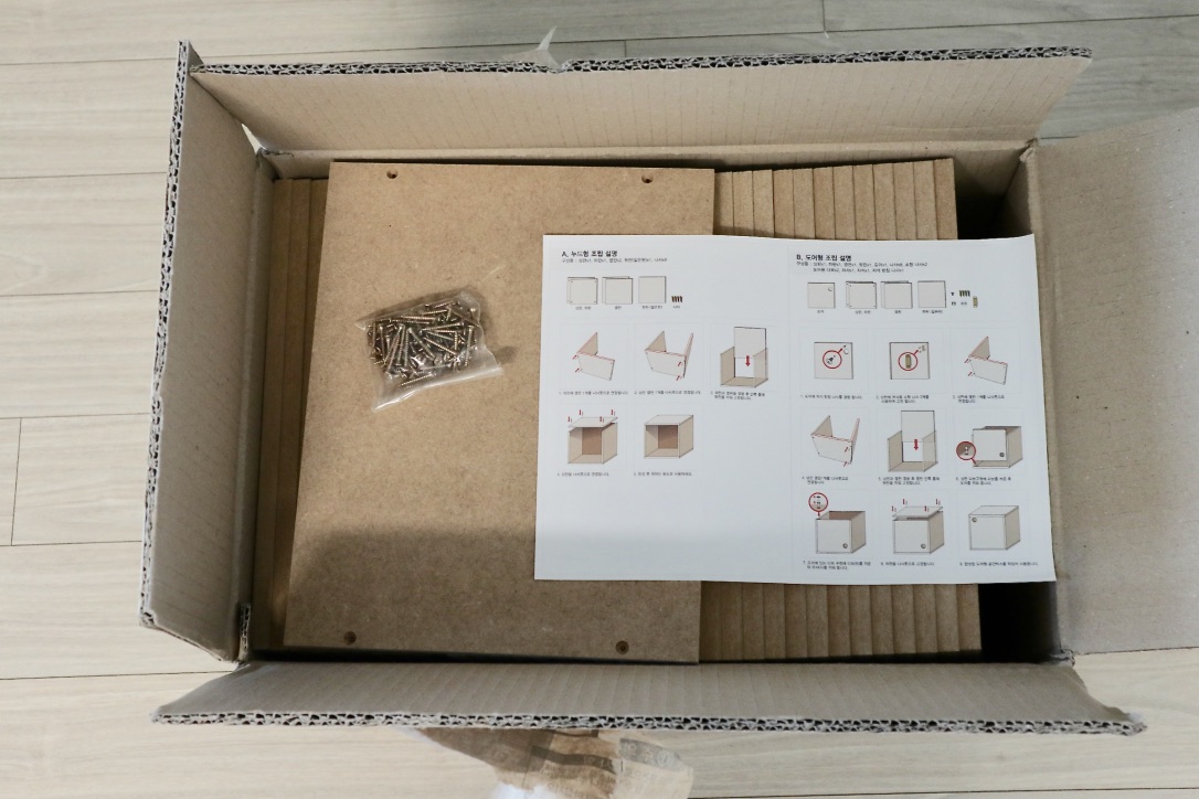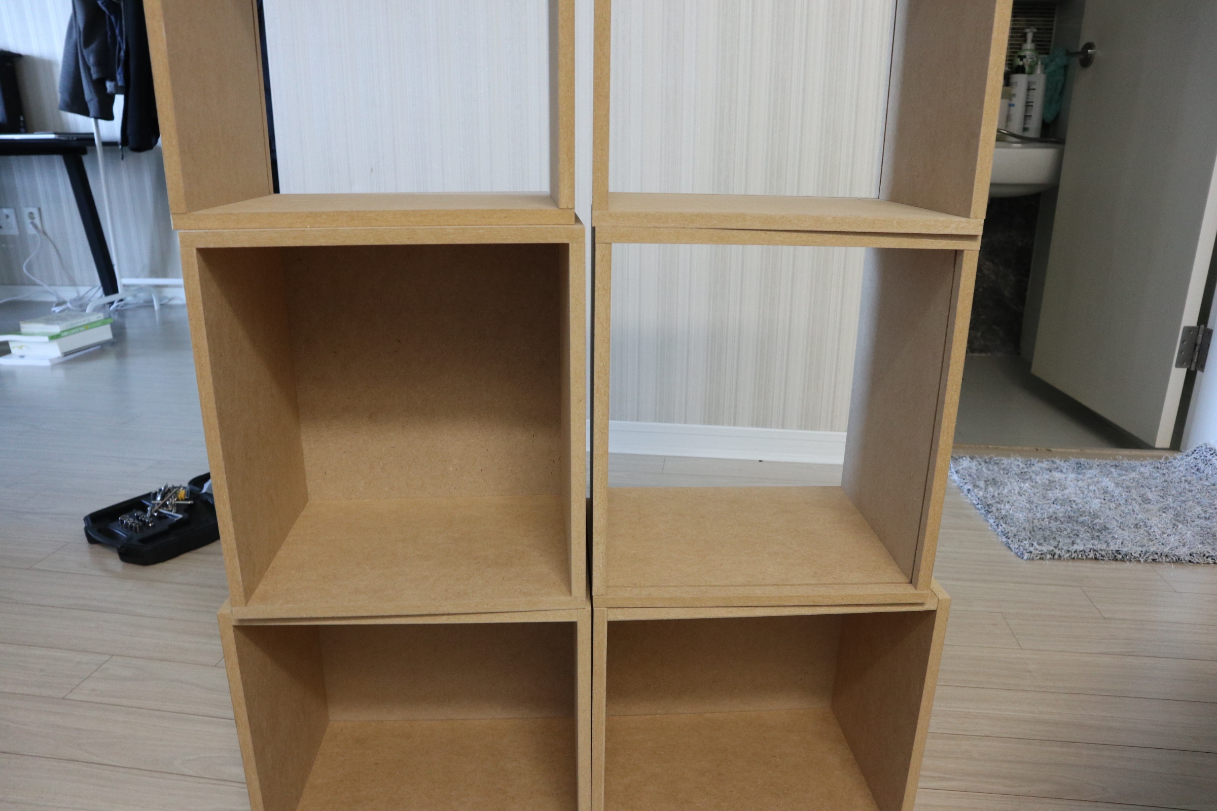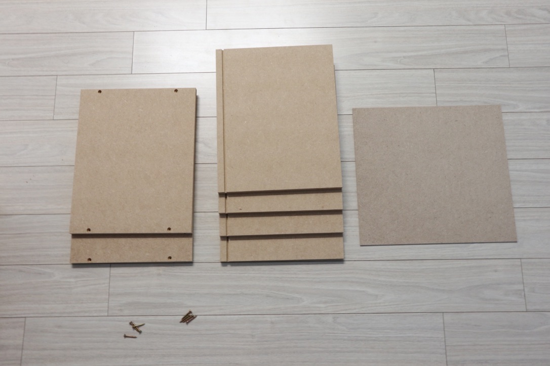기본 구성이에요. 상판,하판, 옆판 2개, 뒷판 1개가 필요해요. 상하판은 나사박기 쉬우라고 타공이 되어있어요.