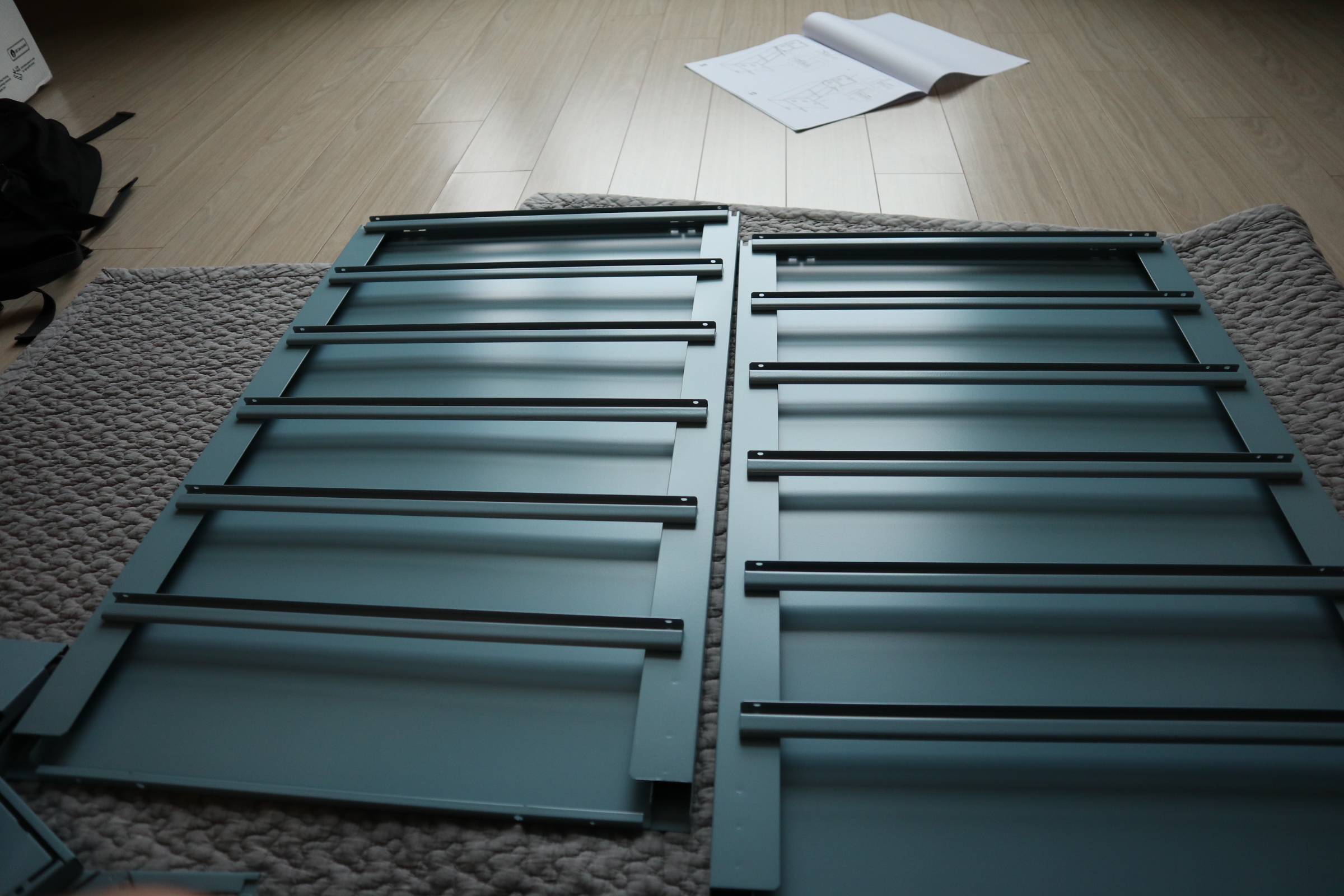 설명서에 없어서 몰랐던 내용인데 레일을 끼워서 고정시켜야 합니다. 위처럼 걸친후 힘줘서 내리면 아래처럼 고정됩니다.
