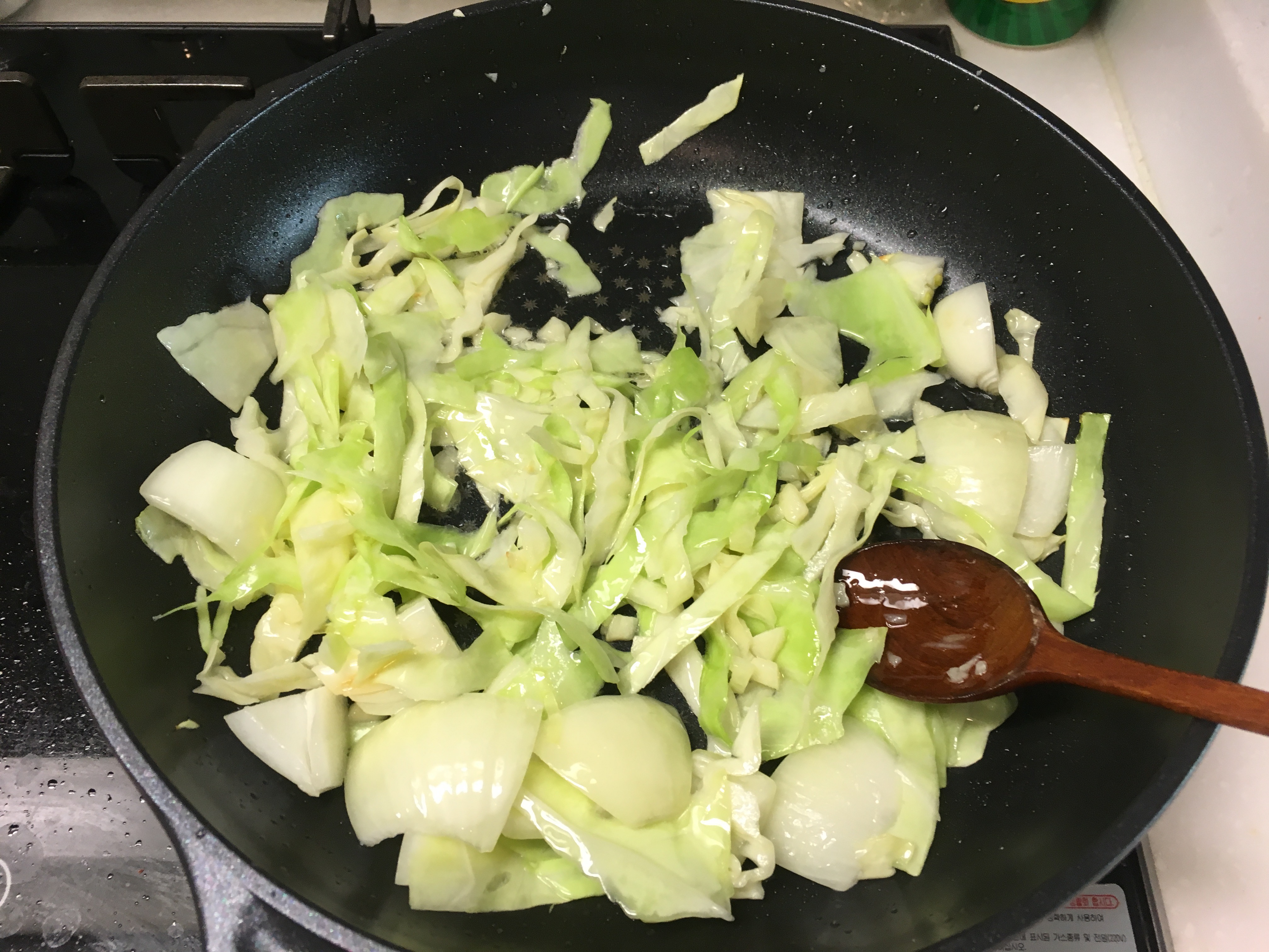 소금을 살짝 넣어줍니다. 소금을 넣는건 간도 있지만 양배추 숨을 죽일려고 넣는거에요.