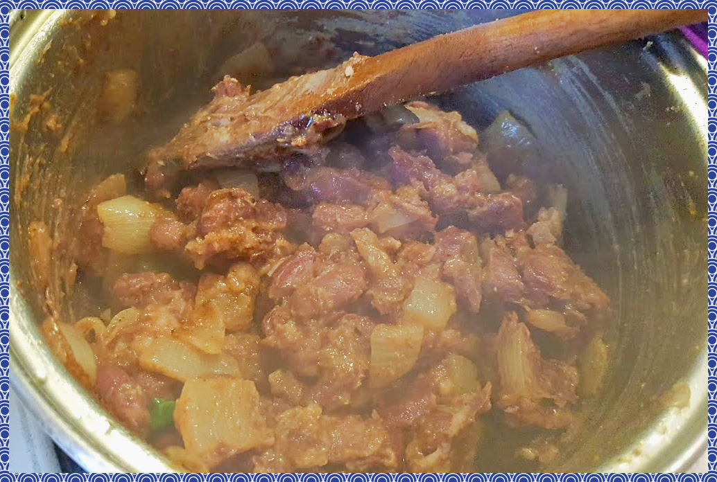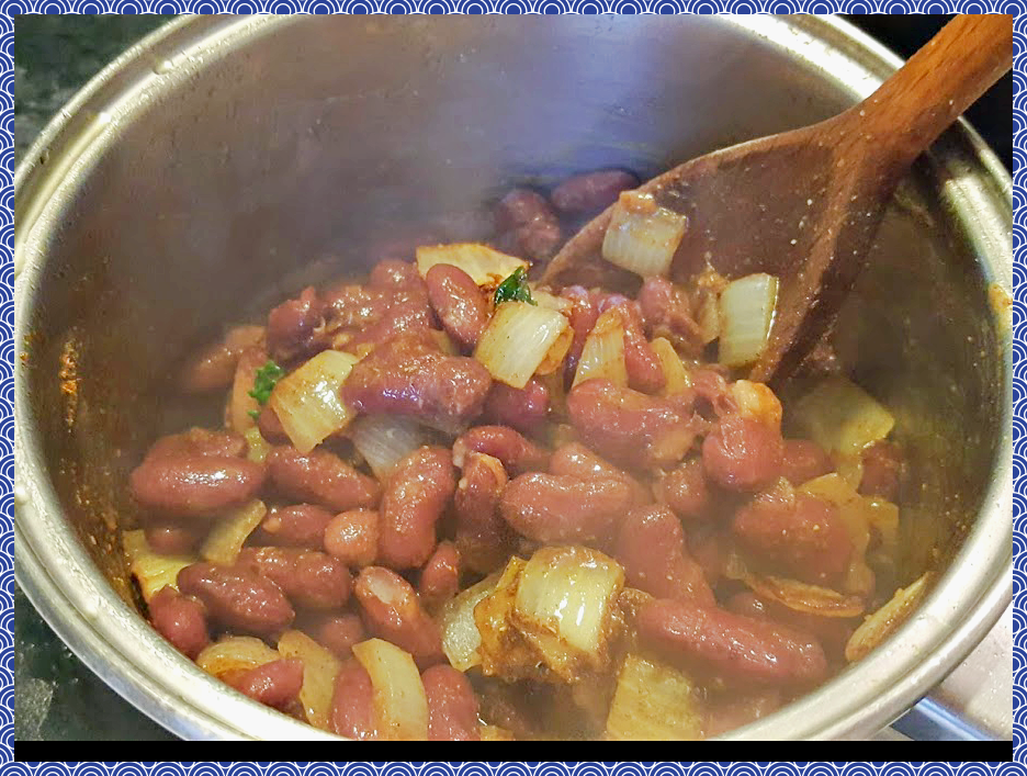 양파를 볶는 팬에 콩을 넣어주신후 위 향신료와 소금을 각 1 티스푼씩 넣어줍니다.