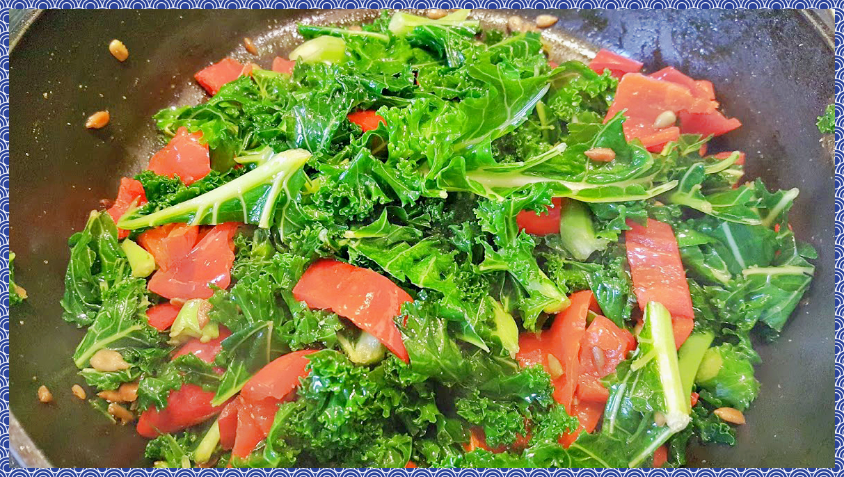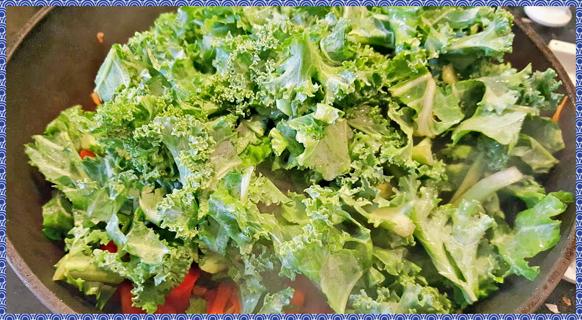 여기에 깨끗히 씻은 케일을 먹기 좋은 크기로 자르고 냄비에 넣어 같이 볶아주세요. 케일의 양이 처음엔 너무 많이 보이지만 케일은 열을 가하면 숨이 죽기때문에 조금 많다 싶을정도로 해야 적당해요.