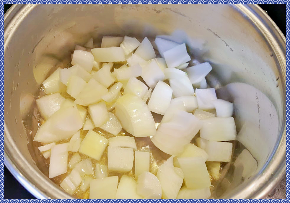이제 강낭콩을 요리해 볼께요. 오일을 두른 냄비에 작게 썰은 양파를 넣고 볶아주세요.