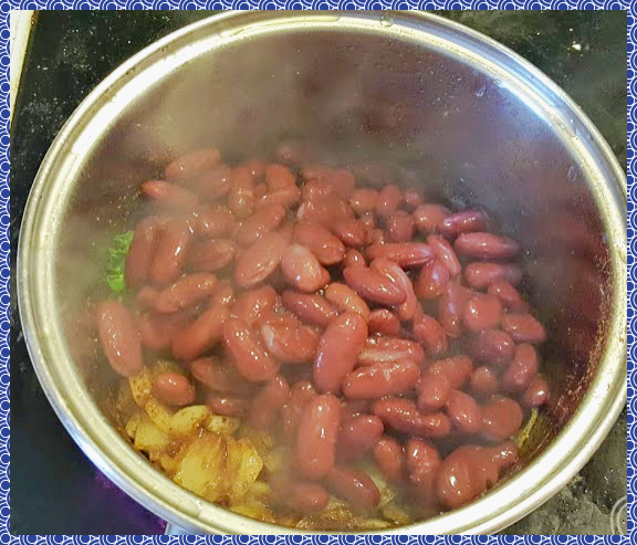 그리고 잘 섞어주세요. 불은 약불로 유지 하셔야 해요. 케일 몇조각이 콩에 같이 섞여들어갔네요.
